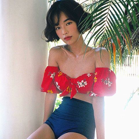 Chọn những màu rực rỡ hơn nếu bạn thích, bởi mùa hè là mùa của sự nóng bỏng và sặc sỡ mà. Chiếc áo crop trễ vai duyên dáng với tay phồng phối hợp với chiếc quần tắm lưng cao không cùng màu, thật sự sẽ mang đến cho bạn vẻ vintage của những năm 80-90.