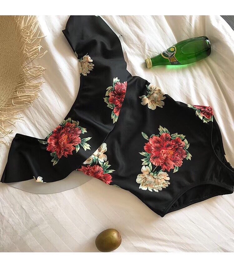 Ngại ngùng vì phần eo “hơi đầy đặn”? Có vẻ bạn nên chọn loại bikini 1 mảnh với họa tiết hoa cùng cổ nhún bèo. Hoa lá và bèo giúp giảm bớt vẻ đơn điệu của bikini đen. Xu hướng retro đang lên ngôi thế nên hãy cân nhắc bộ bikini hơi hướng cổ điển này nhé.