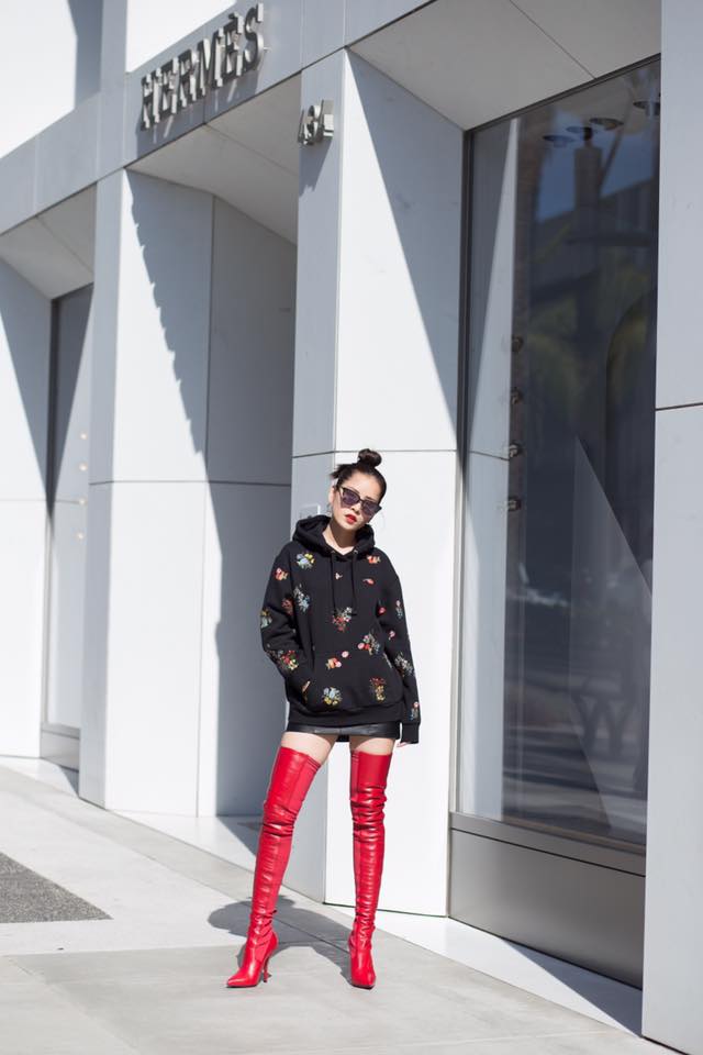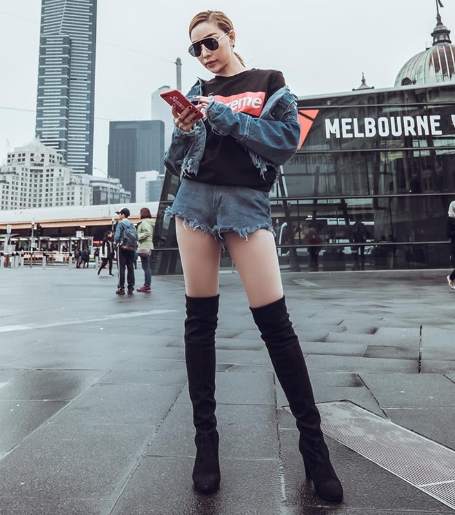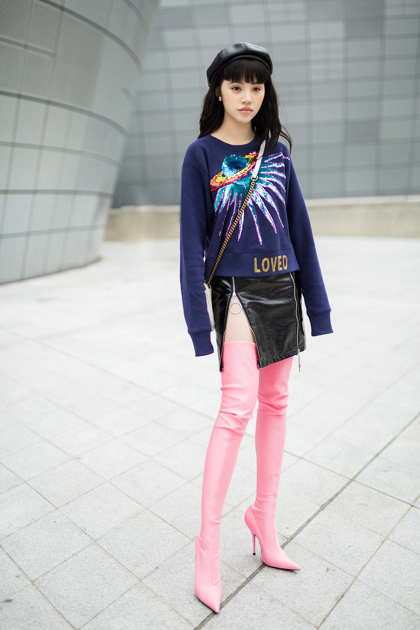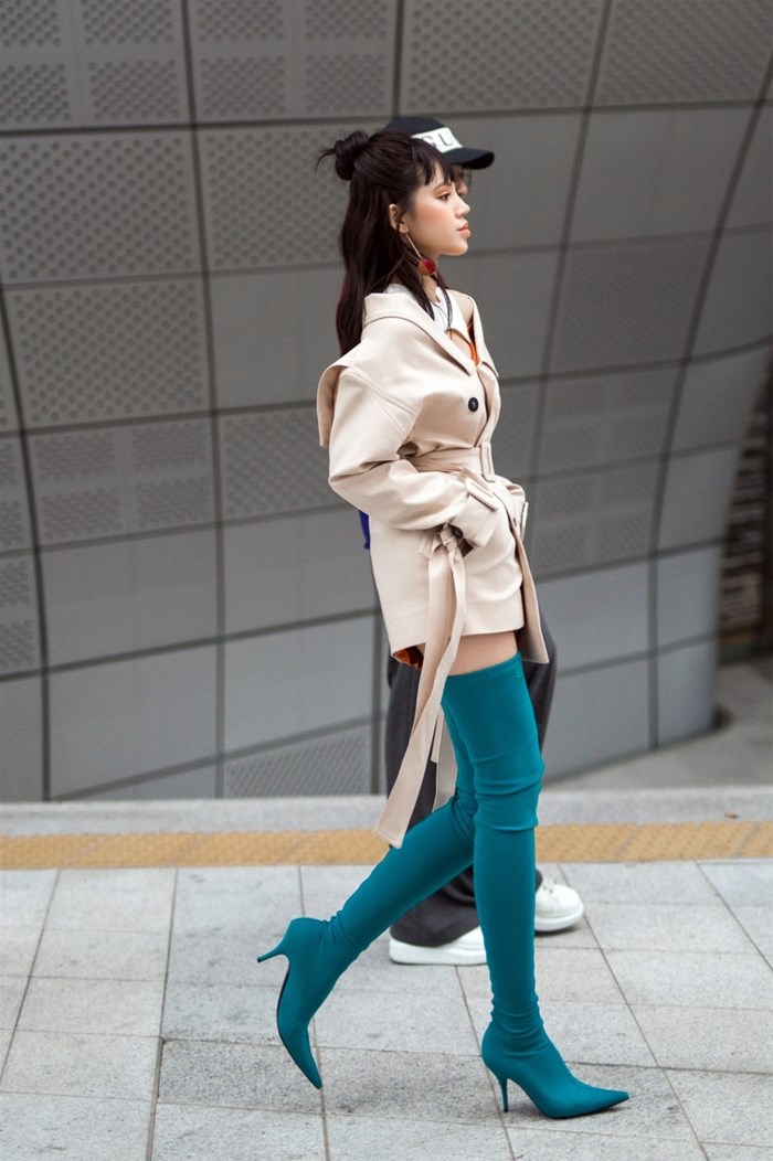 Một đôi bốt hai số phận. Jolie Nguyễn đã từng xuất hiện với đôi bốt này trên đường phố Seoul. Đôi bốt giúp Jolie khoe khéo đôi chân dài và cực thon gọn của mình. Bộ trang phục không quá cầu kỳ với chân váy da đen xẻ cao, áo sweater nhưng lại được lên tạp chí Vogue. Đơn giản bởi người mặc biết kết hợp những items cực phù hợp với vóc dáng của mình.