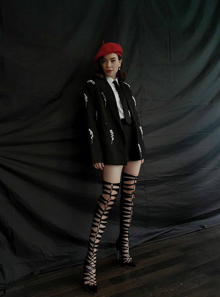 Cùng mẫu bốt dây đan cao bất tận này, Hồ Ngọc Hà có một gợi ý khác với set đồ màu đen nhìn rất thanh lịch.