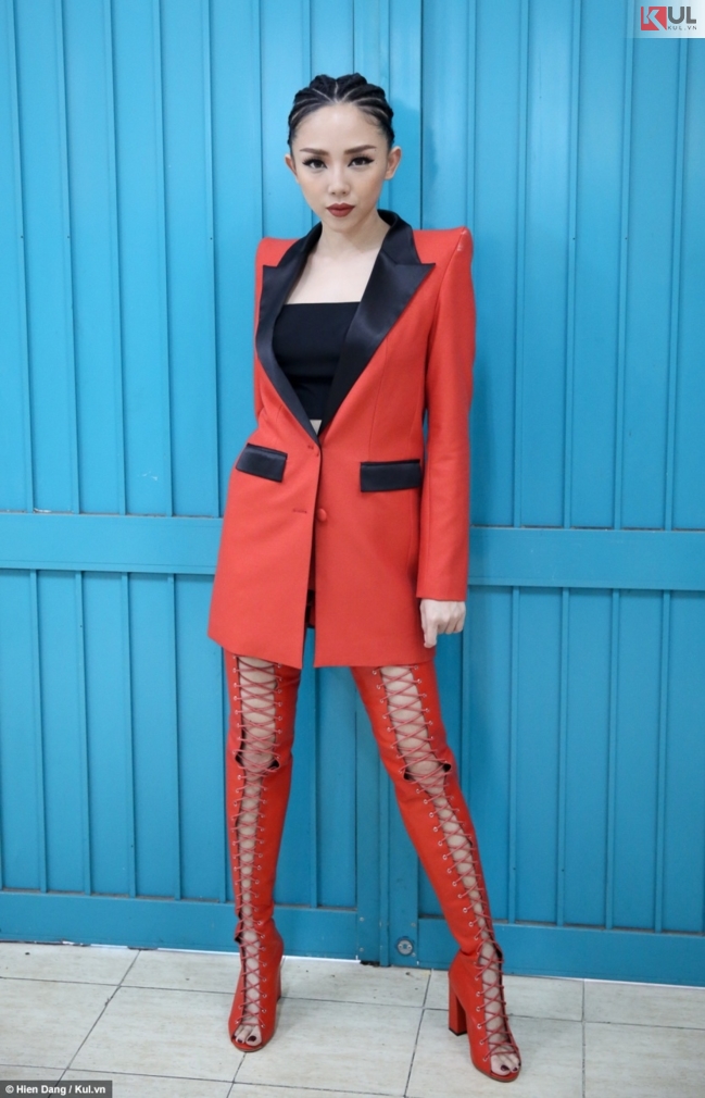 Và cũng có khi Tiên chọn đôi bốt dây đan màu đỏ rực, kết hợp với vest đỏ nhưng nhìn vẫn đẹp, không bị làm quá.