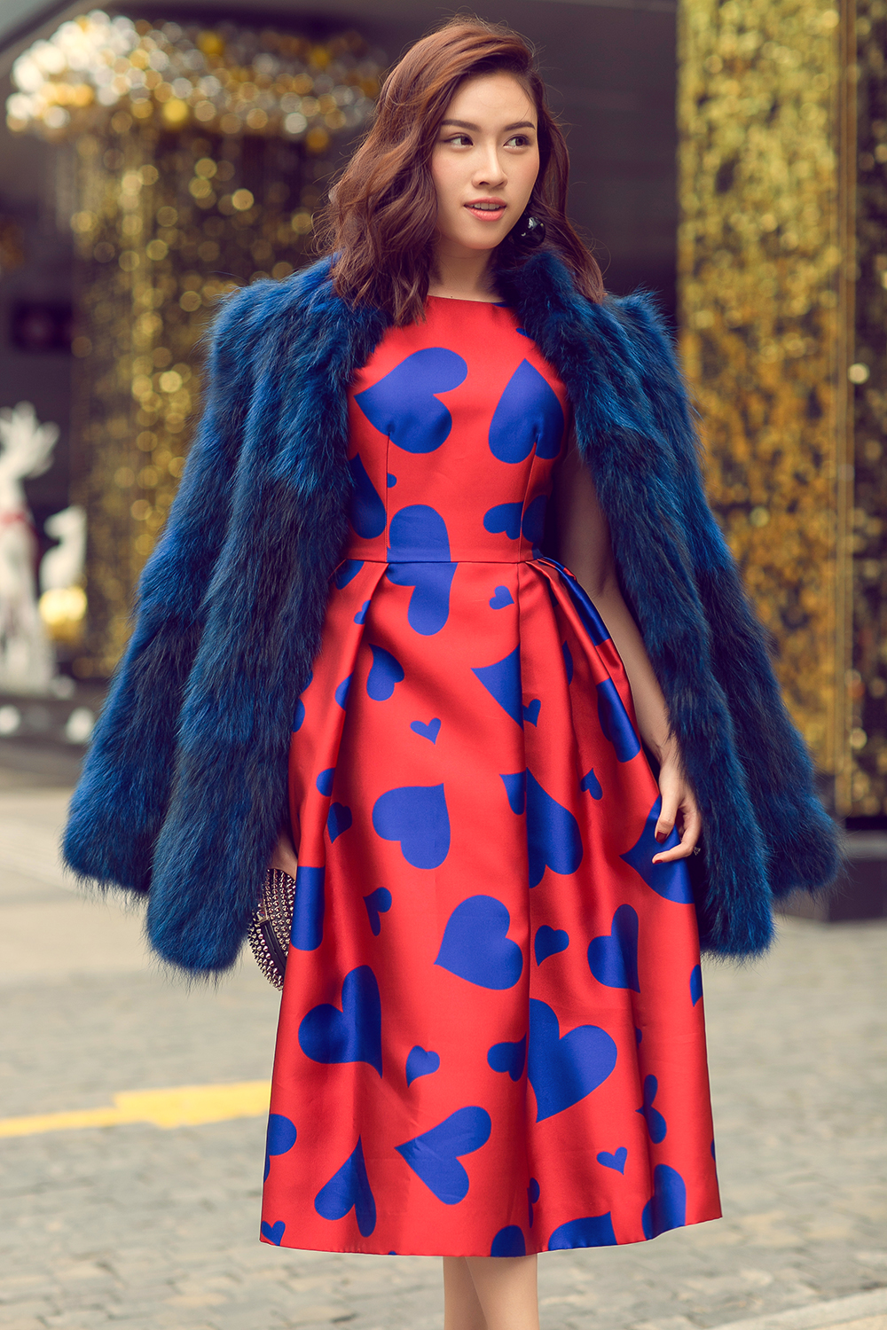 Thanh Thanh Huyền diện váy xoè nền đỏ điệu đà, kết hợp hoạ tiết trái tim xanh.