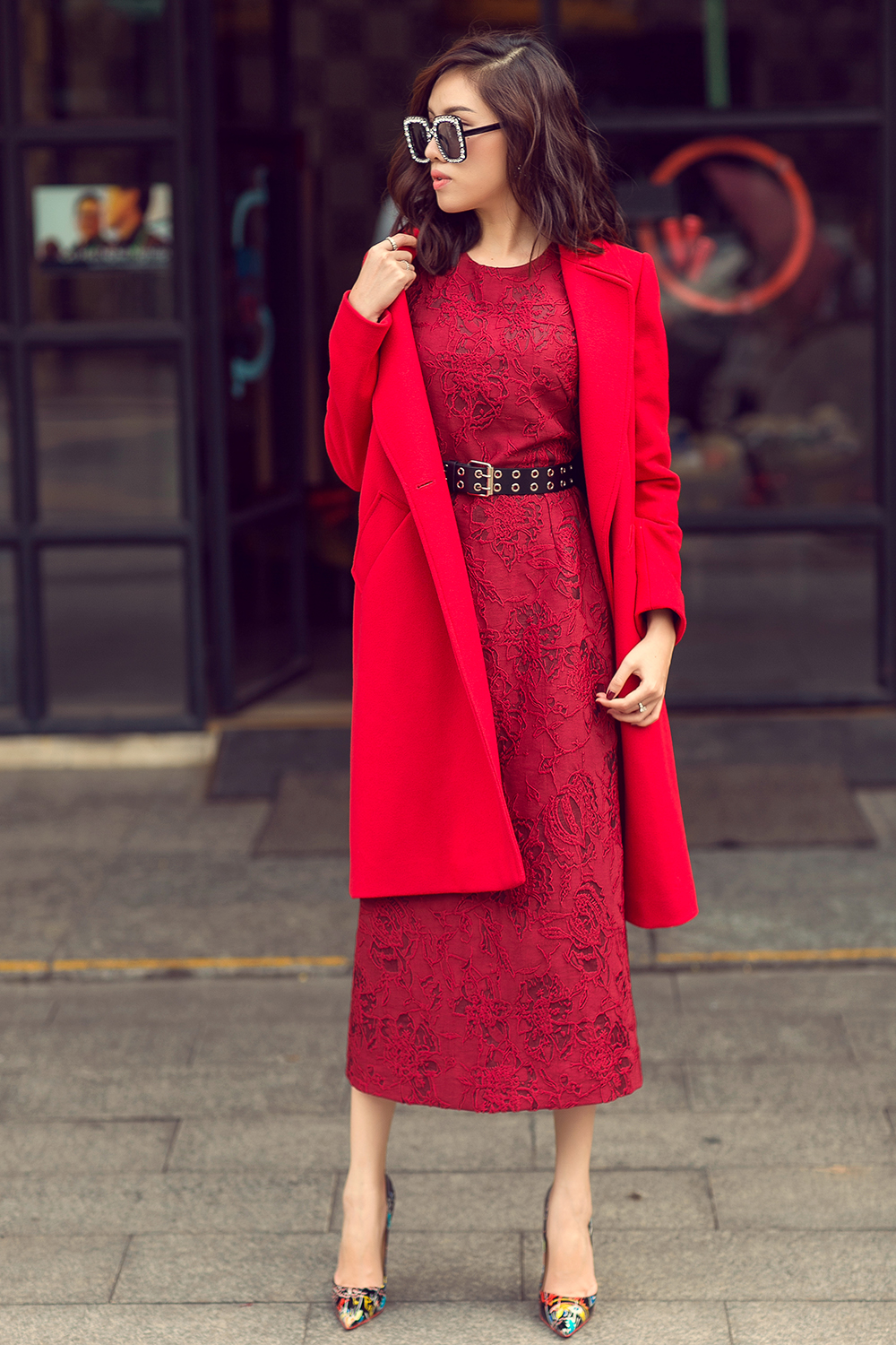 Đầm bodycon qua gối với tông màu đỏ rượu trầm ấm được người đẹp phối cùng măng tô rực rỡ bên ngoài.