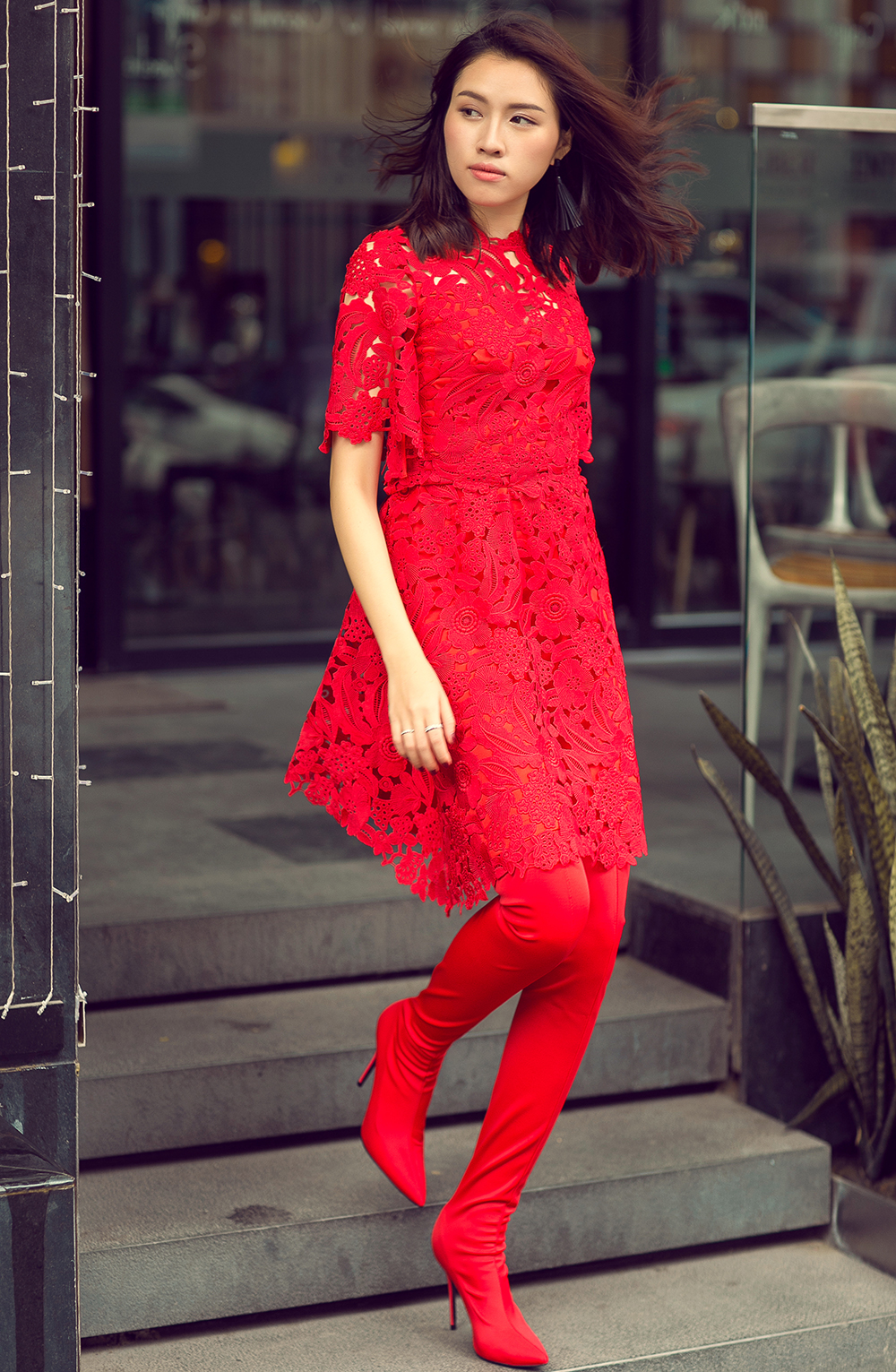 Chiếc váy ren hoạ tiết to bản từ phong cách nữ tính, thanh lịch trở nên cá tính, có phần gai góc khi được phối cùng giày boots cao đồng điệu sắc đỏ, món phụ kiện hot nhất của những tháng cuối năm 2017 và đầu năm 2018 này.