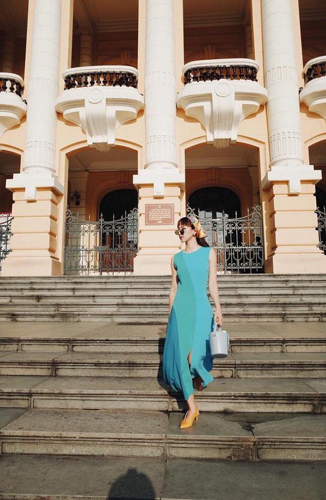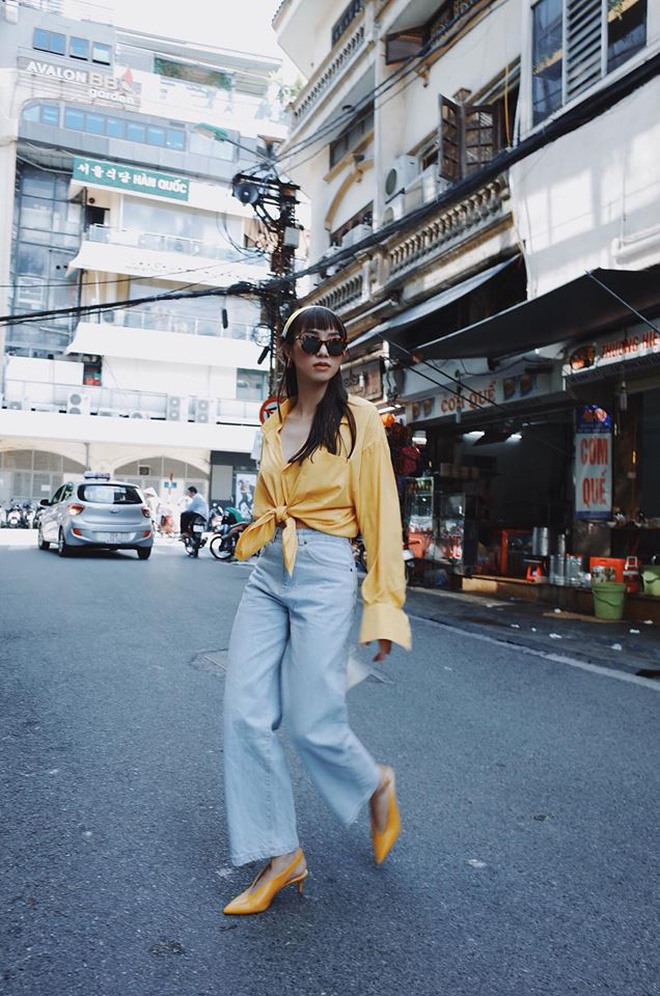 Cô nàng chơi màu sắc cực cao tay khi nhấn nhá sắc vàng murtard đồng điệu giữa đôi slip on mũi nhọn và khăn buộc đầu mix cùng váy suôn xanh.