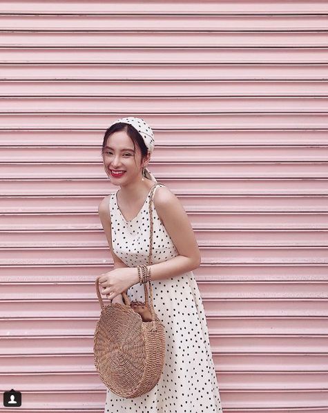 Salim không phải người duy nhất dùng khăn buộc đầu để nhấn nhá cho tổng thể trang phục. Trước cô nàng, Helly Tống đã từng hóa thân thành quý cô cổ điển với cách cột khăn minh tinh kinh điển thập niên 50-60