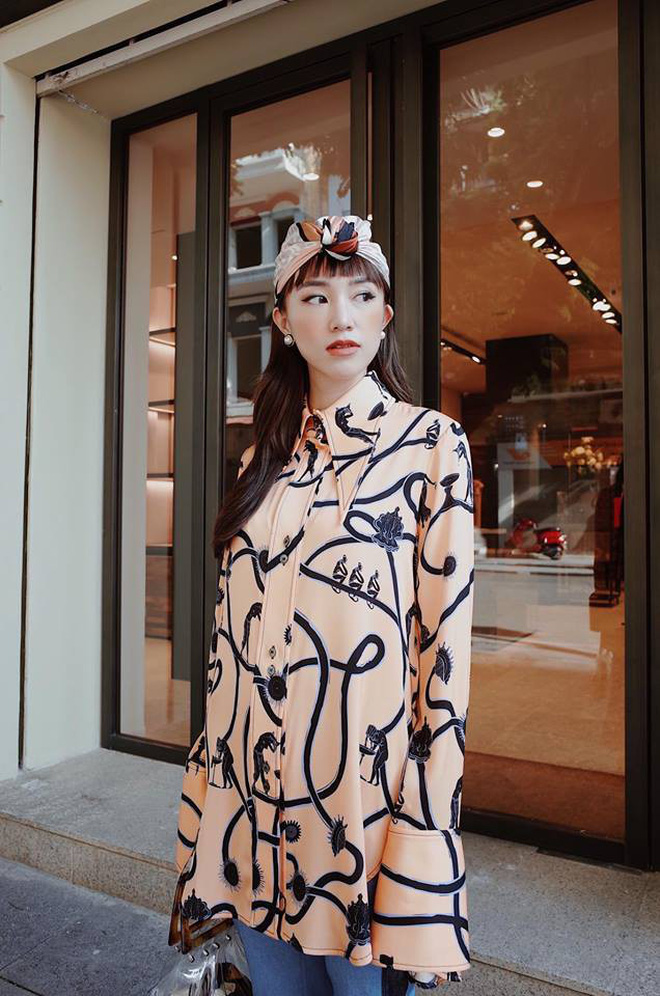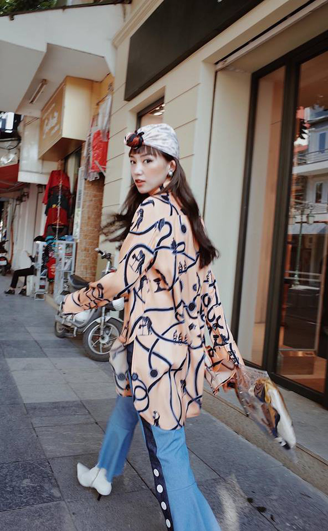 Dùng khăn buộc đầu làm phụ kiện không phải là mốt mới xuất hiện, nhưng Salim đã biến tấu style vintage này trở nên hiện đại hơn khi phối cùng những items thời trang trendy.