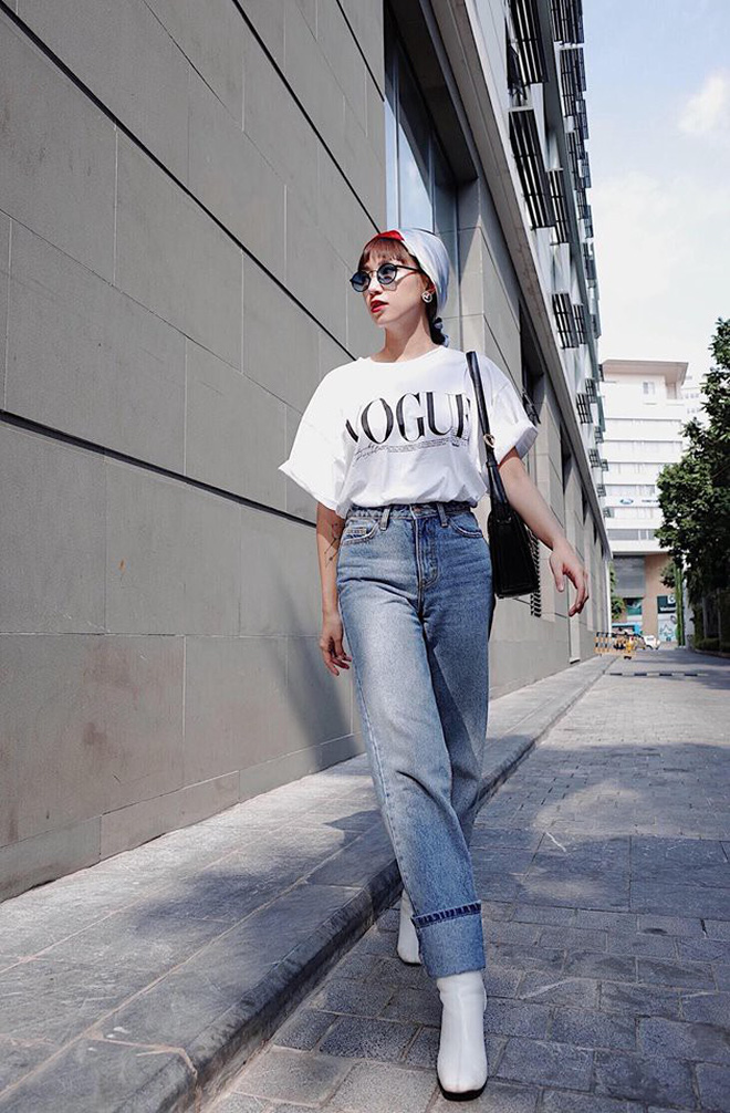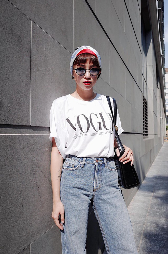 Set đồ vô cùng đơn giản với áo phông trắng và jean cạp cao bống trở nên chất hơn khi được Salim mix cũng khăn buộc đầu màu sắc. Cô nàng còn không quên nhấn nhá tí son đỏ cùng kính mát đồng xu đậm chất vintage để tăng sức hút cho set đồ.