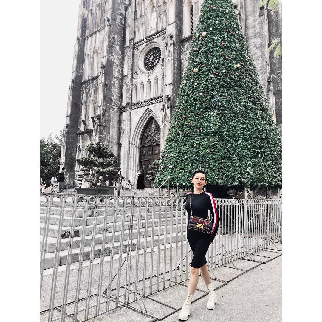 Chiếc váy đen ôm sát phô diễn đường cong cơ thể được Tóc Tiên khéo léo kết hợp cùng đôi boot hầm hố và túi đeo chéo in chữ cá tính.