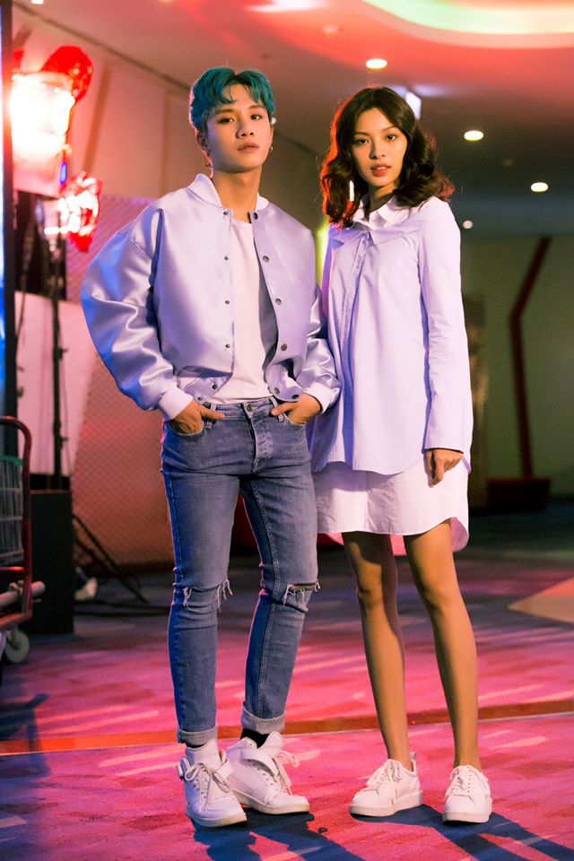 Sự hoà phối nhẹ nhàng của tông màu pastel, chỉ là bomber, quần jeans và sneaker trắng nhưng có vẻ sắc xanh cổ vịt đã mang tới vẻ ngoài nhã nhặn cho cặp đôi.
