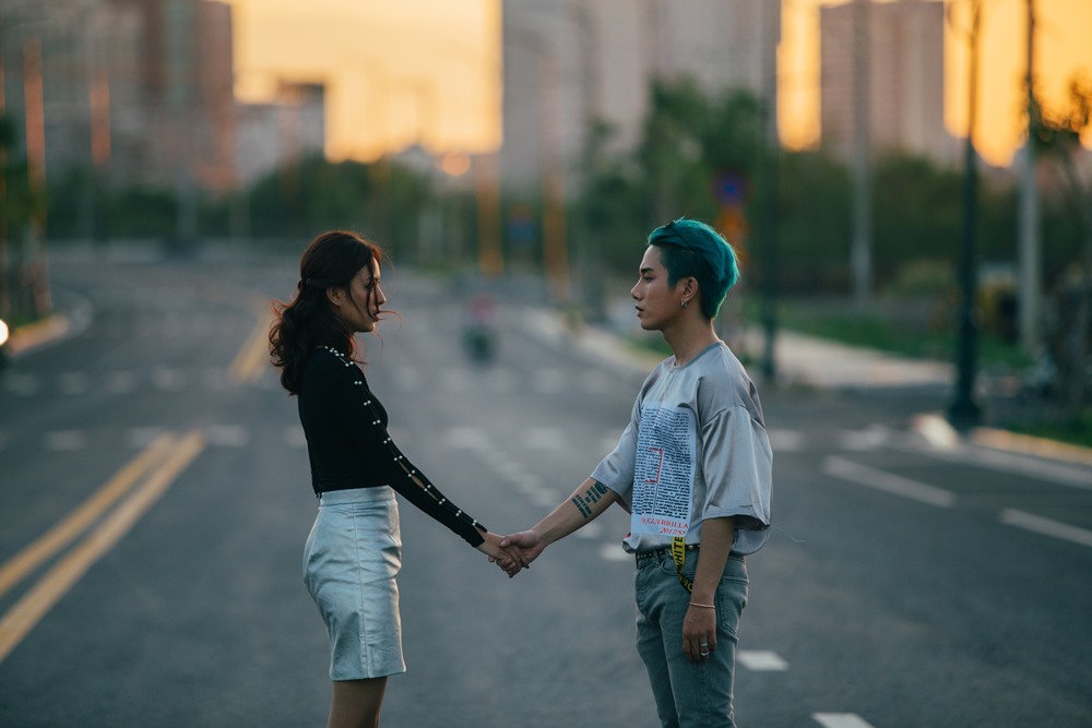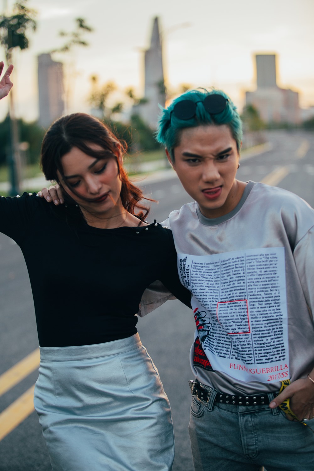 Juun mang dáng vẻ cool ngầu với sơ mi biến hoá rực rỡ đi cùng jeans rách, còn Tú Hảo diện chân váy da, bomber jacket… toàn chất liệu nghe tên đã thấy “gangster” rồi, đúng không?