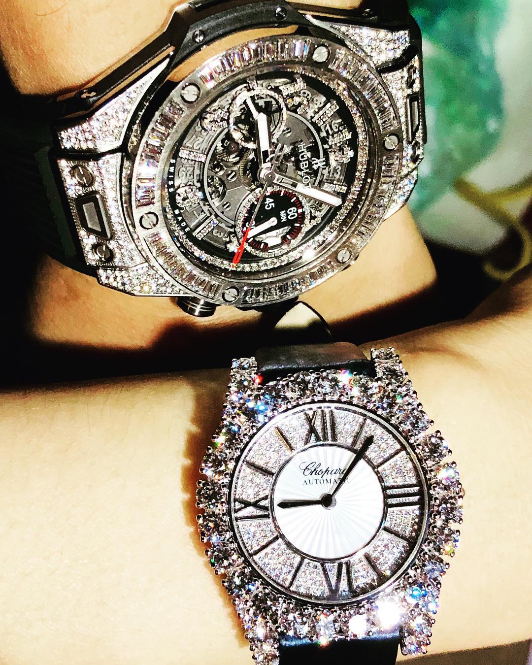 Ca sĩ Lệ Quyên hồ hởi khoe hai chiếc đồng hồ kim cương đắt giá từ Hublot và Chopard. Sự lấp lánh từ những viên kim cương sang chảnh khiến cho nữ ca sĩ cảm thấy vô cùng thích thú.