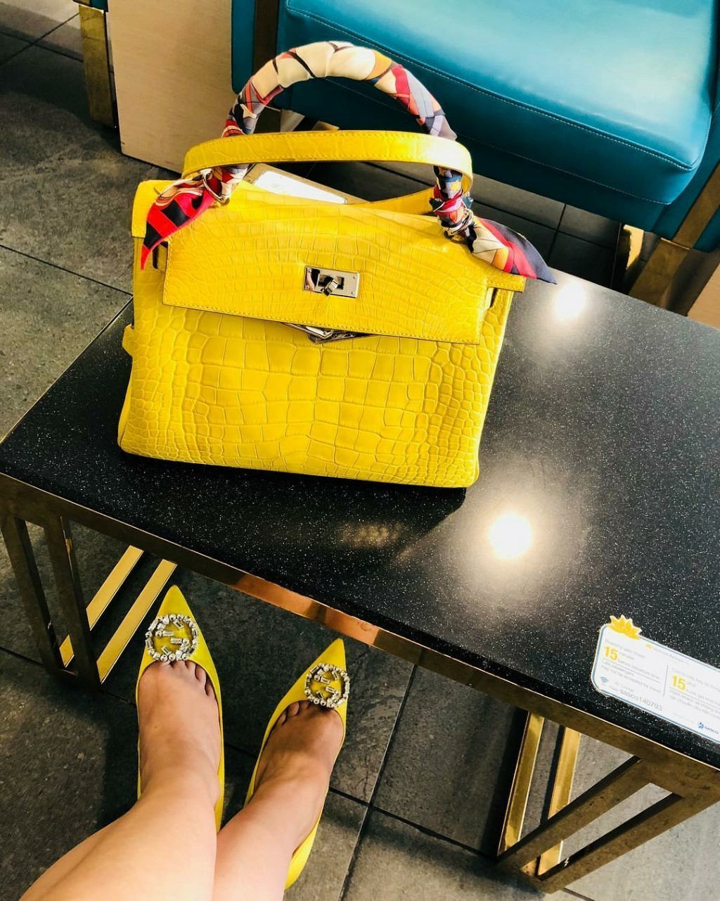 Không chỉ dừng lại ở những chiếc đồng hồ xa xỉ, Lệ Quyên còn “vung tay” sắm hẳn giày cao gót của Gucci và túi xách da ton sur ton. Tết 2018 này, nữ ca sĩ chắc chắn sẽ tươi tắn không thua gì những đóa mai nở rộ.