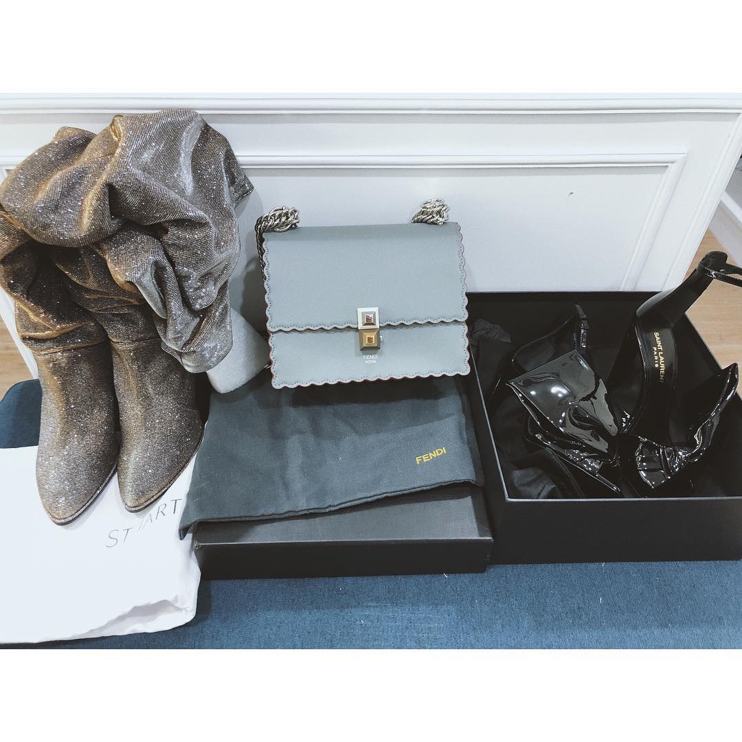 Văn Mai Hương rất ít khi mua sắm nhưng đã mua thì “chất phát ngất” thế này đây. Chiếc túi xách dáng hộp đến từ nhà mốt Fendi, giày cao gót của Saint Laurent và một chiếc boot cao cổ lấp lánh đúng trend 2018 là những gì Văn Mai Hương “trang hoàng” cho ngày tết thêm tươi.