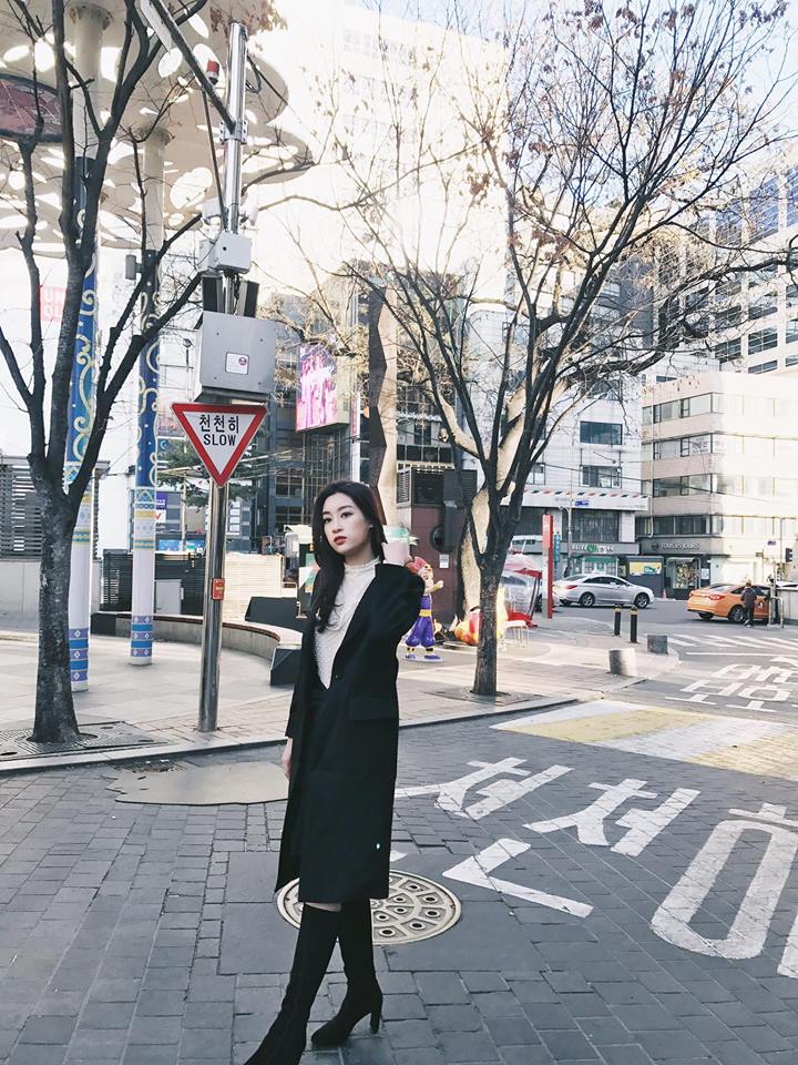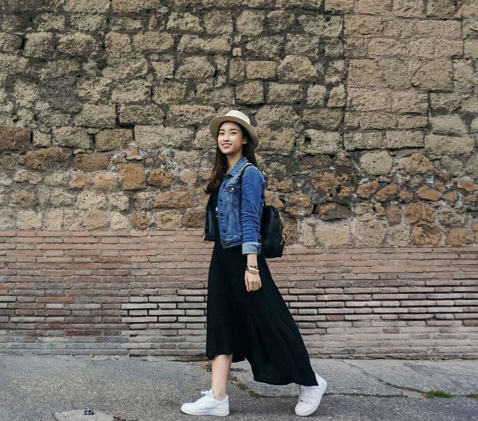Đôi lúc lại trở về làm cô nữ sinh mộng mơ và năng động với váy đen cotton mix cùng áo khoác jeans.