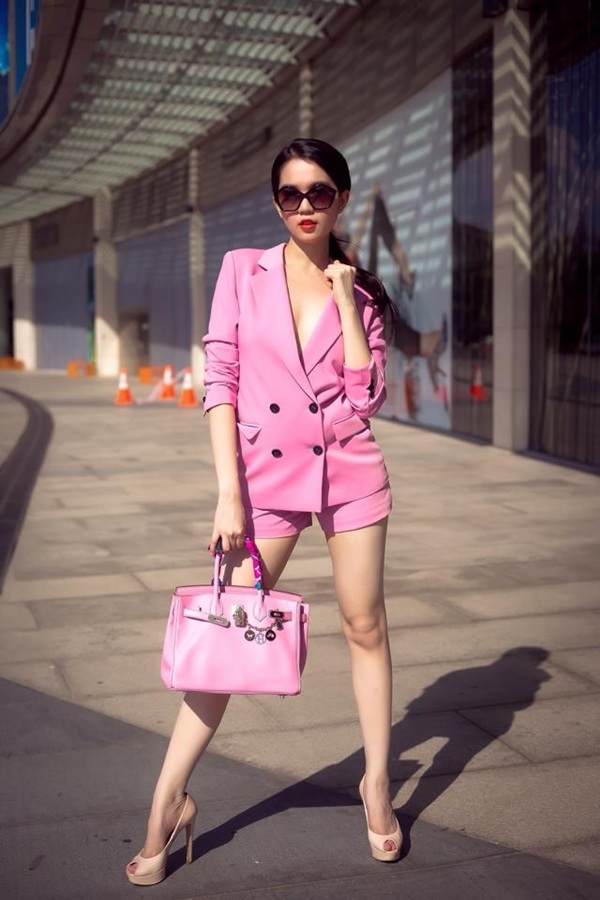 Ngọc Trinh bánh bèo, hiền thục trong bộ vest hồng mix với quần short ngắn tông xuyệt tông