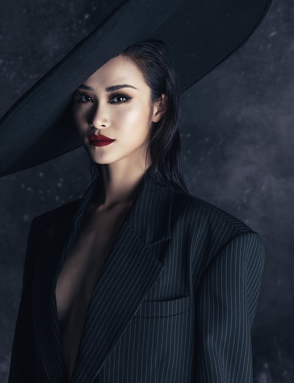 Minh Tú phô diễn nét đẹp mạnh mẽ, hơi chút nam tính nhưng cũng không kém phần duyên dáng, mềm mại trong bộ vest xám sọc