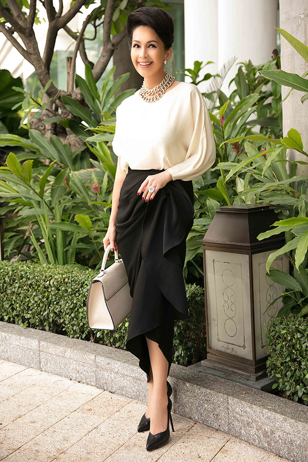 Diễm My thời thượng, thanh lịch, cuốn hút với bộ cánh kết hợp chân váy và áo rời, đều được thực hiện theo cấu trúc bất đối xứng, mốt trang phục đặc biệt được Đỗ Mạnh Cường lăng xê trong mùa Xuân Hè năm nay.