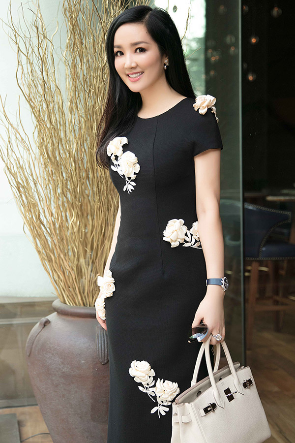 Hoa hậu đền Hùng - Giáng My chọn thiết kế dáng bodycon cổ điển, thanh lịch nhưng vẫn phô diễn được đường cong quyến rũ của cơ thể. Bộ trang phục có điểm nhấn với hoạ tiết hoa được thực hiện bằng kỹ thuật thêu ruy băng đang được ưa chuộng đặc biệt trong làng mốt. Tông màu trắng ngả vàng của túi, giày cao gót tạo nên một tổng thể ăn khớp với hoạ tiết của trang phục.