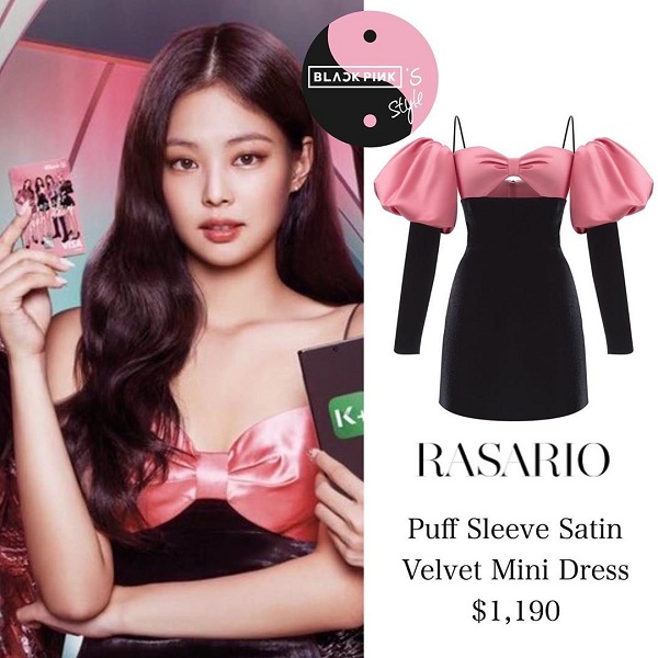 Rosé trong kiểu váy đen búp bê chất liệu nhung thiết kế bèo hai bên tay áo