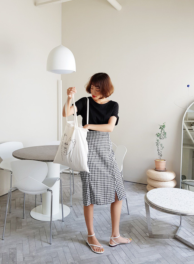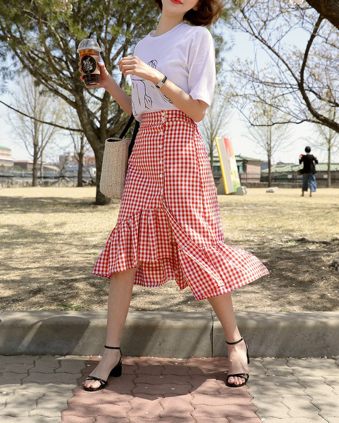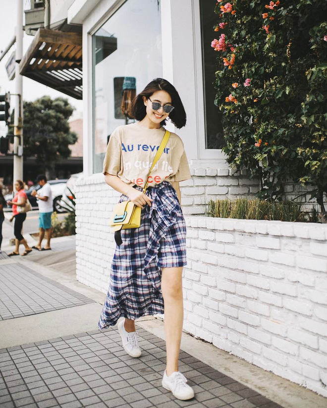 Các bạn có thể thử nghiệm mix chân váy kẻ caro cùng áo phông trẻ trung.