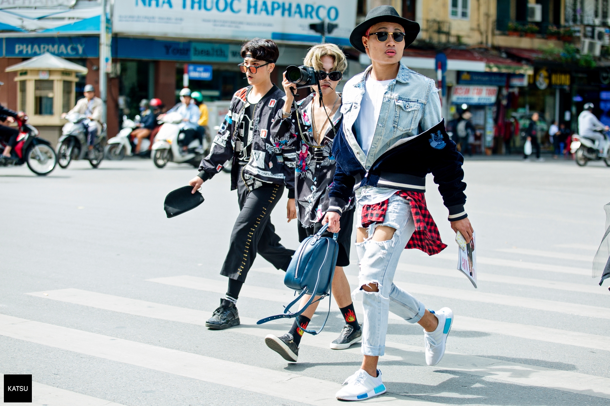 Giống như các nước trên thế giới, loạt bạn trẻ Việt cũng không ngần ngại thể hiện phong cách thời trang khác nhau khi sải bước trên đường phố. Họ áp dụng tất cả các trào lưu hot trên sàn runway quốc tế để biến hóa hình ảnh của mình. Nếu như một bạn trẻ đầu tiên chọn bộ cánh Denim thì chàng fashionista đi cùng cũng sành điệu không kém khi diện chiếc áo khoác patch-work ấn tượng.