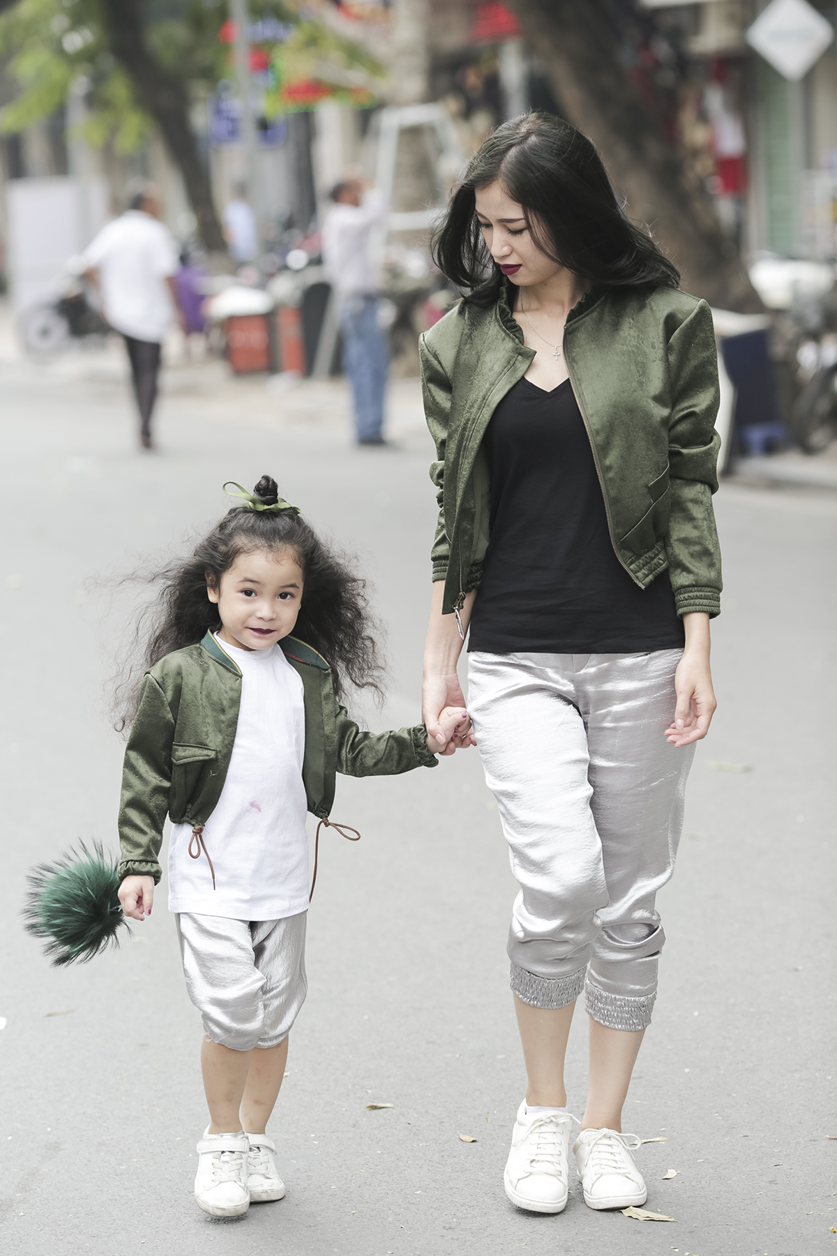 Hay thậm chí cũng độc đáo khi hòa phối trang phục cùng với người thân của mình. Chiếc áo bomber xanh quân đội chính là điểm nhấn nhá trên toàn set đồ của cặp đôi thời trang này.