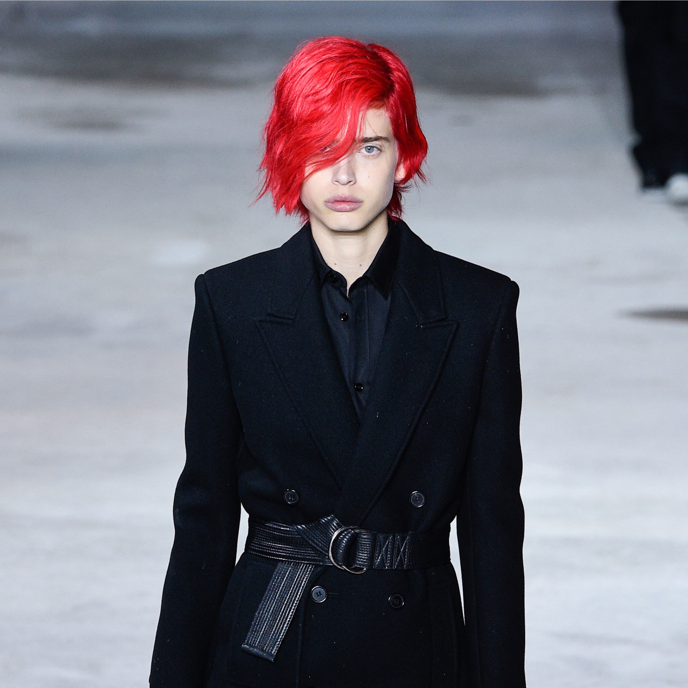 Người mẫu Sean Levy “độc bước” một màu đỏ neon trên sàn diễn của Saint Laurent.