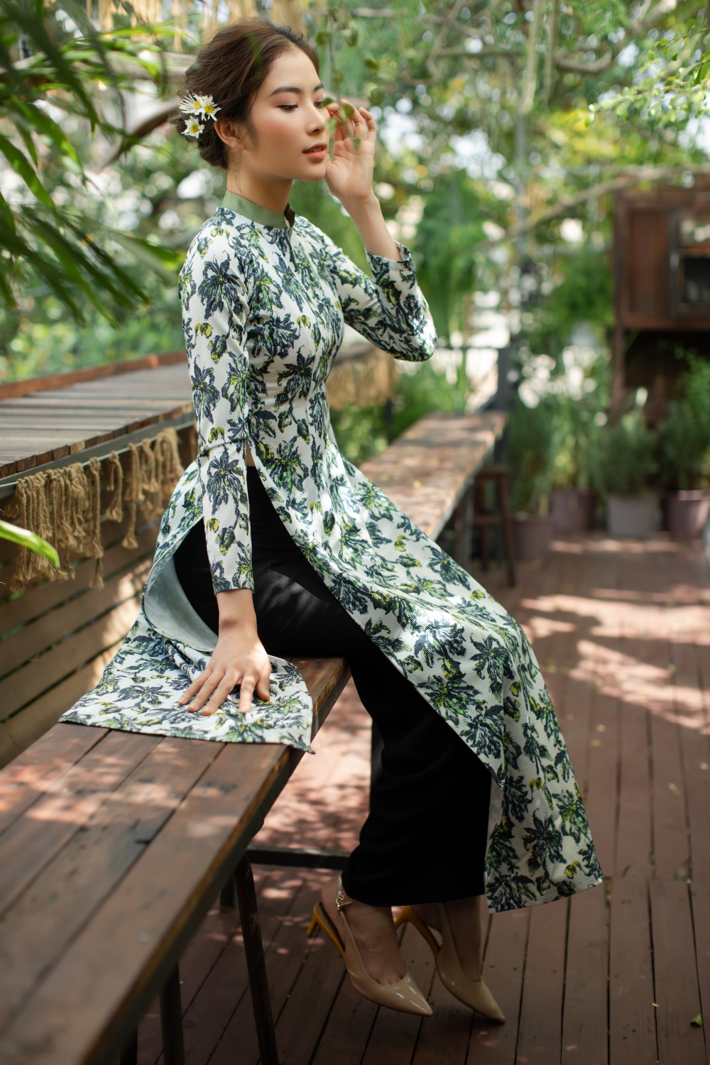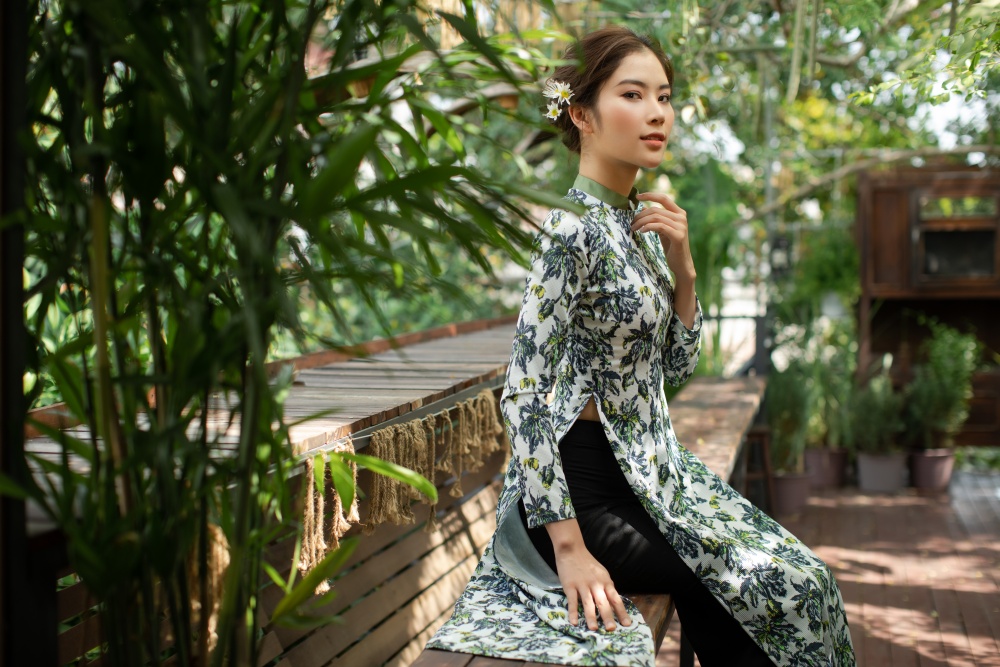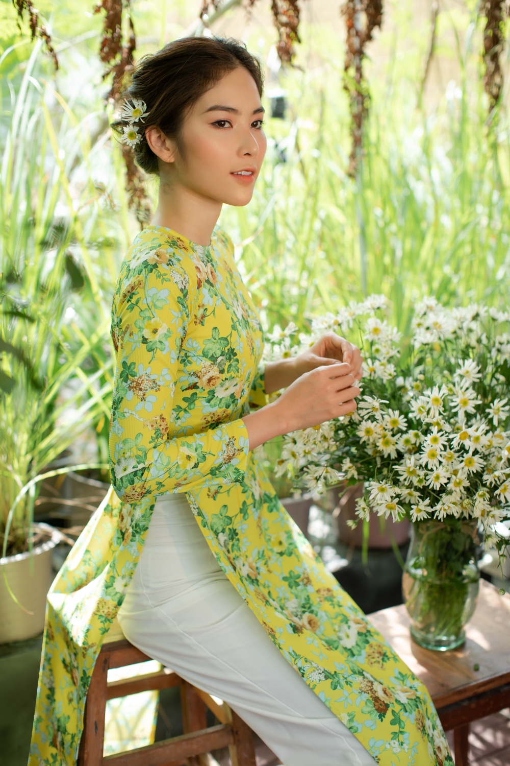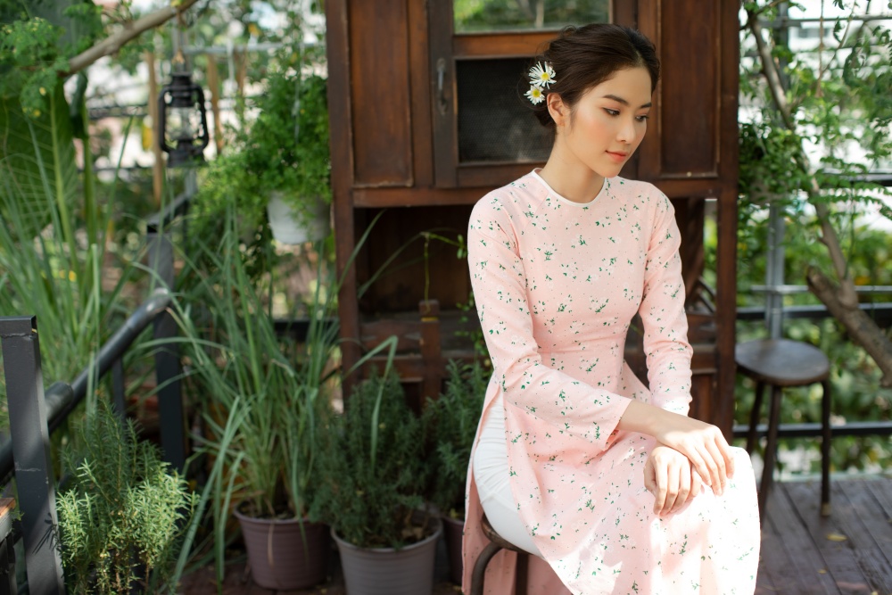 Với gương mặt thuần nét phụ nữ Á đông, chân dài 9X ghi điểm trong mắt người xem bởi lối trang điểm trong veo, nhẹ nhàng cùng tà áo dài thướt tha càng tôn lên nét dịu dàng, ngọt ngào nhưng không kém phần sắc sảo của người con gái Việt Nam.