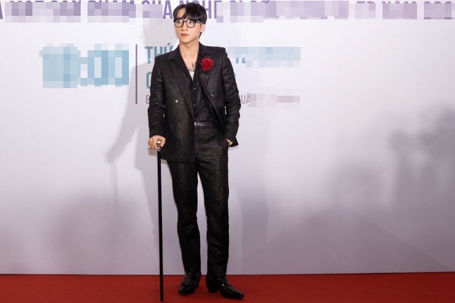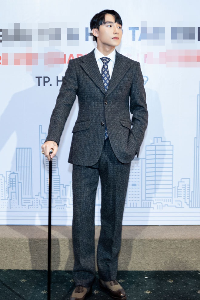 Sơn Tùng trước đó từng diện kiểu vest xám lịch lãm đi kèm cùng với cây gậy ba toong
