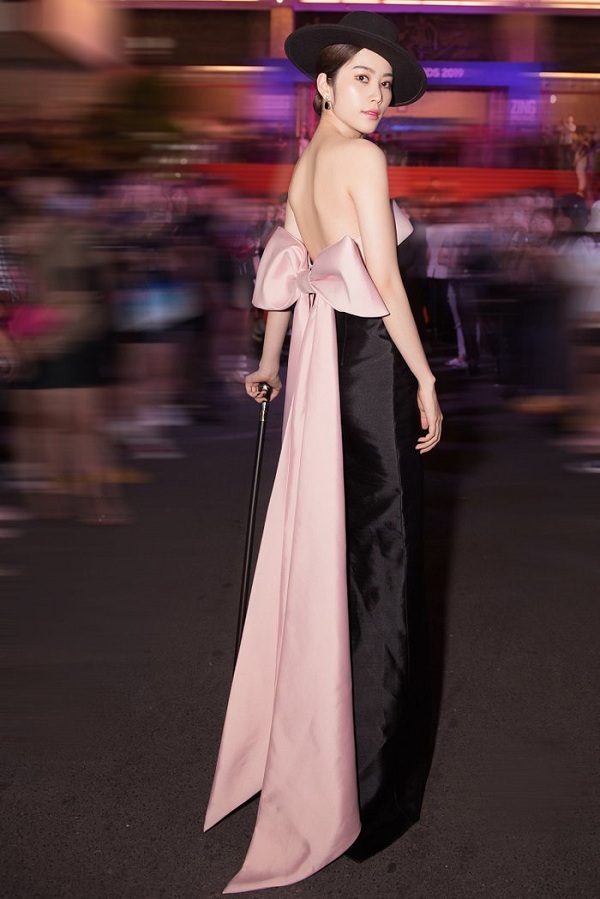 Nam Em hờ hững vòng một trong chiếc váy đen nhấn nhá thiết kế nơ hồng cùng “phụ kiện đặc biệt”