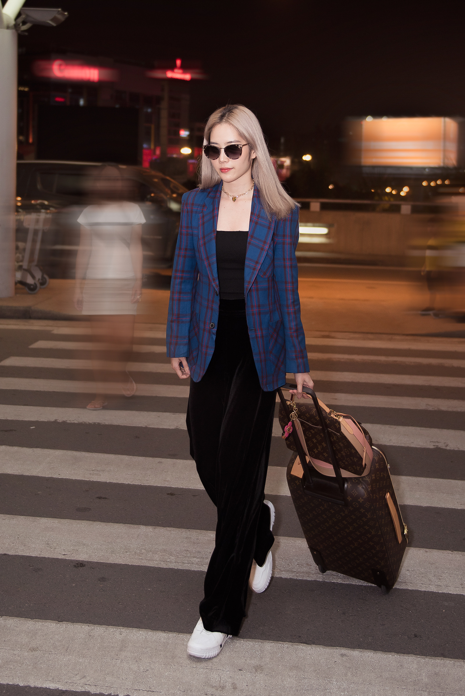 Vừa mới đến sân bay, Nam Em đã nhanh chóng thu hút sự chú ý của nhiều người bởi ngoại hình nổi bật. Người đẹp chọn cho mình phong cách menswear cá tính với cách phối đồ đơn giản nhưng không kém phần thời trang. Diện áo hai dây, quần ống rộng và giày thể thao khá thoải mái, cô nàng khéo léo mix cho mình chiếc áo khoác blazer sọc xanh khiến tổng thể trở nên nổi bật và hút ánh nhìn hơn.