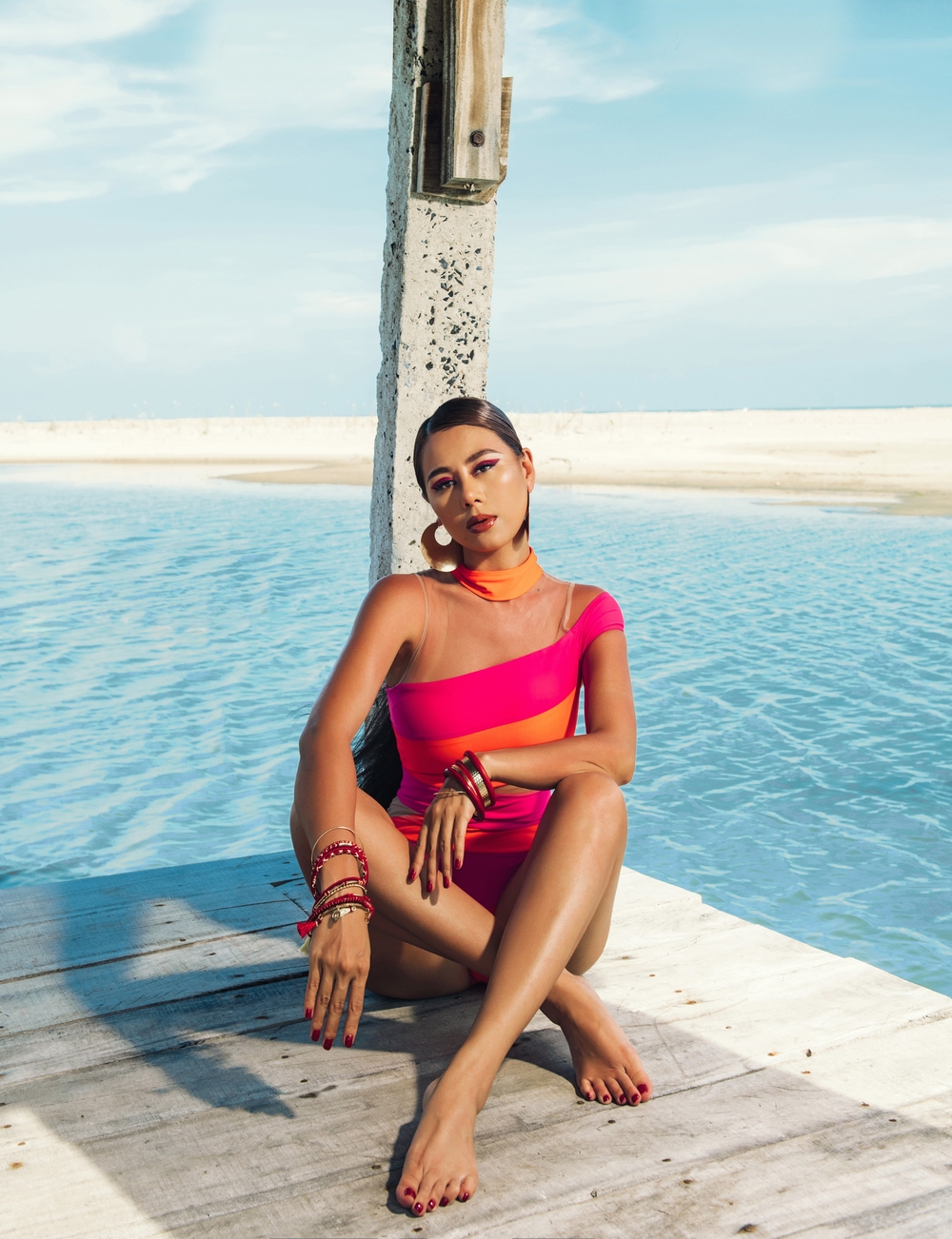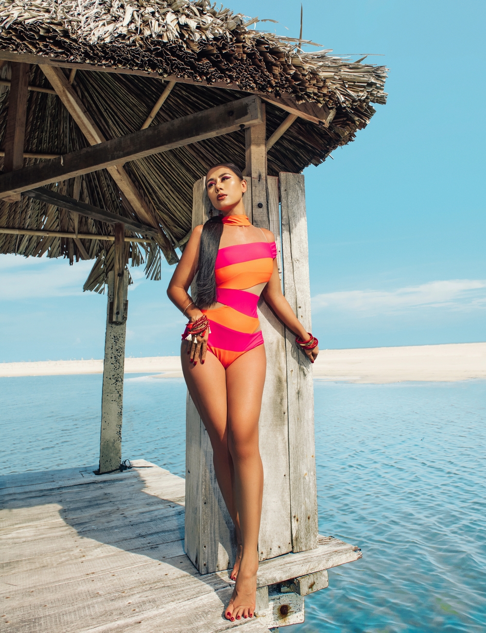 Nam Thư ưu tiên lựa chọn những thiết kế áo tắm mang màu sắc nổi bật như xanh lá, hồng, cam… để chào hè. Người đẹp lựa chọn một bờ biển xinh đẹp để thực hiện bộ ảnh mới.