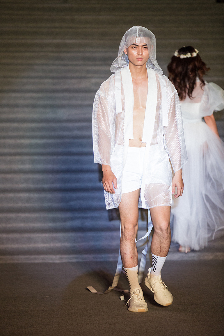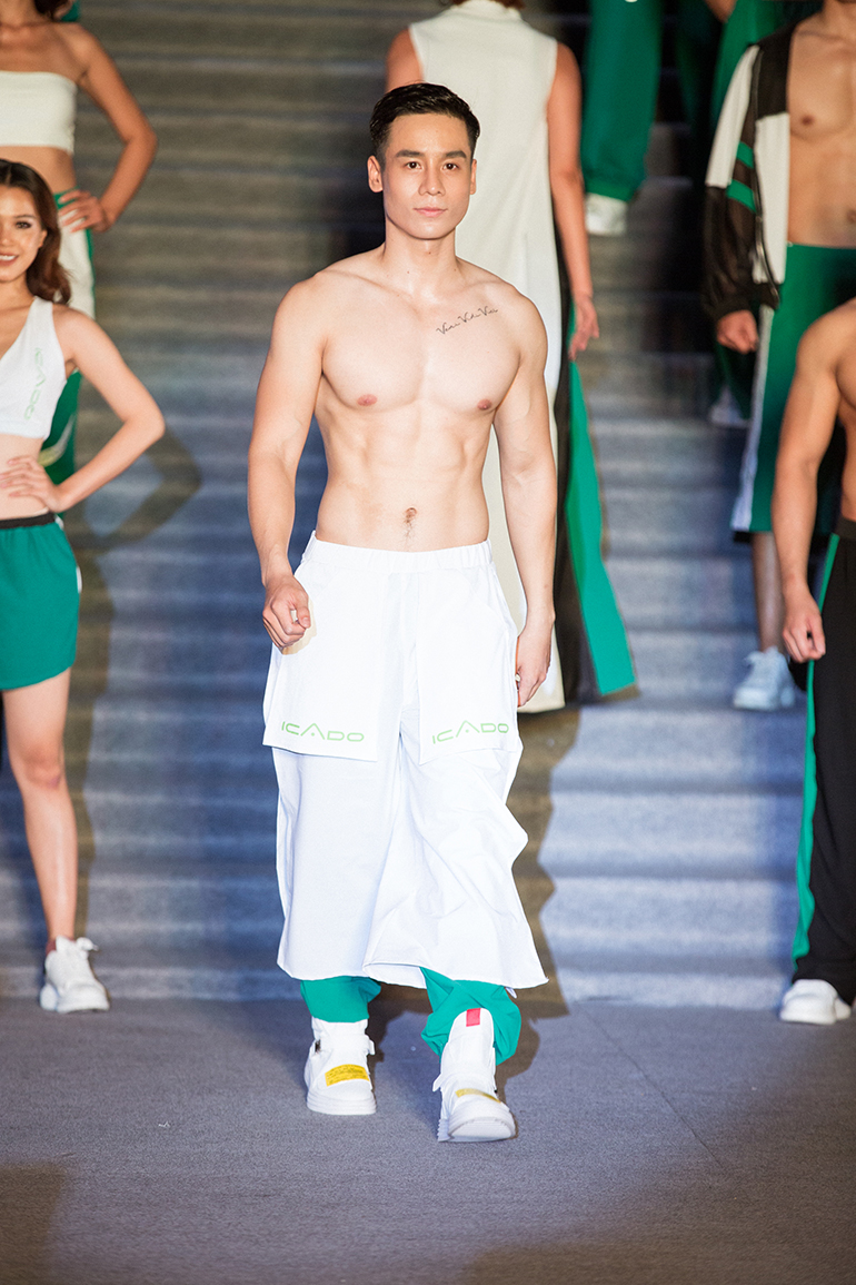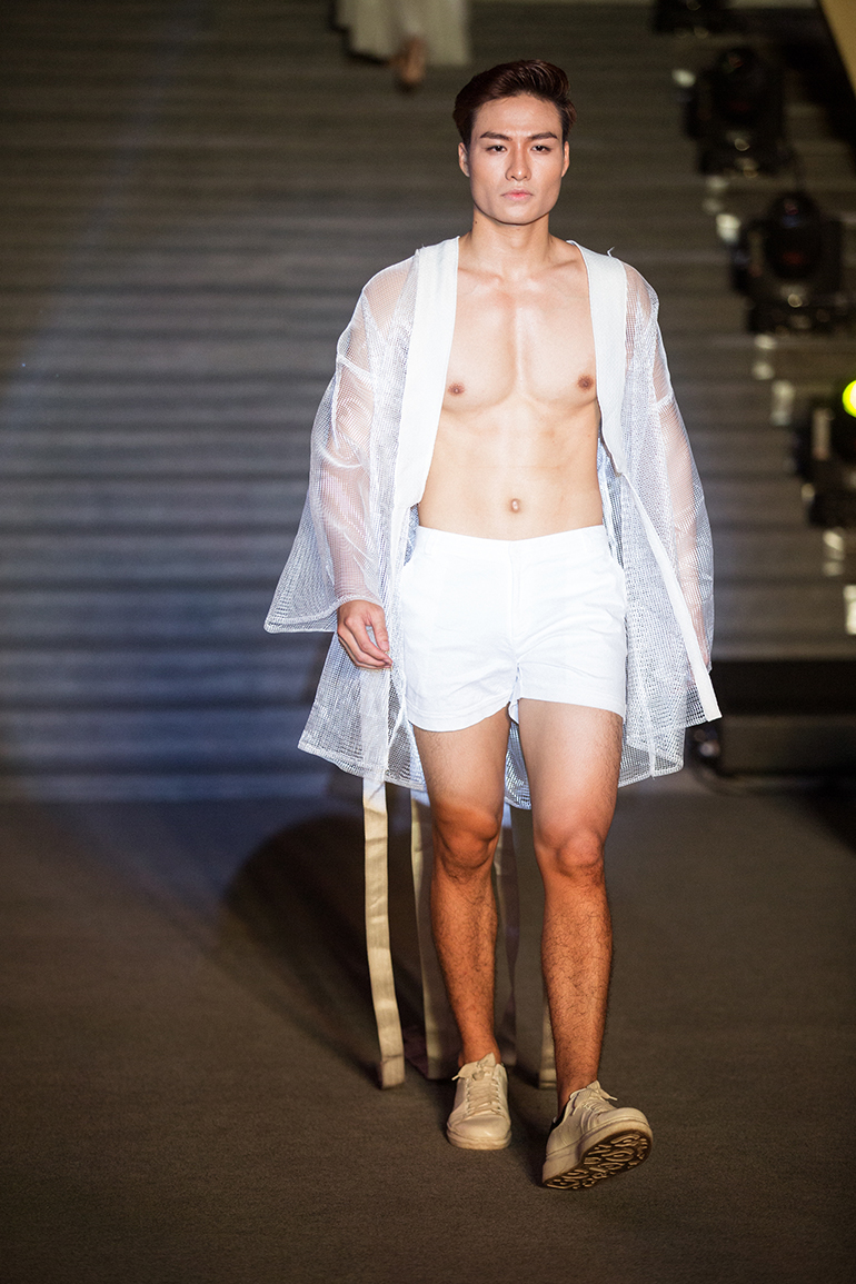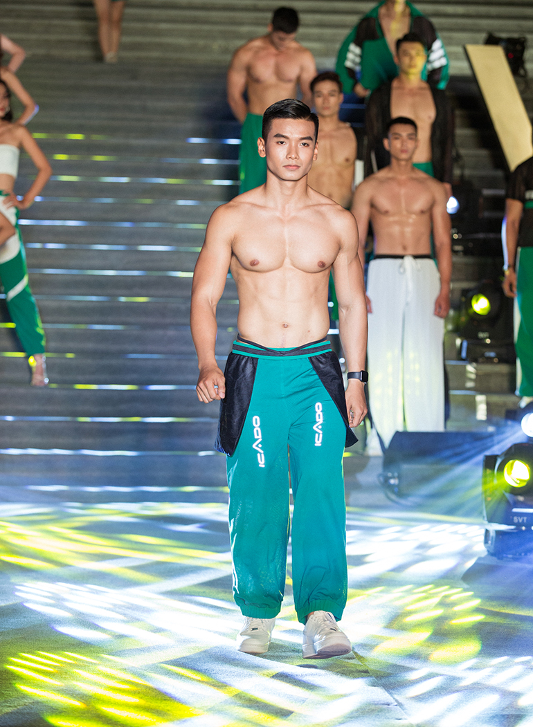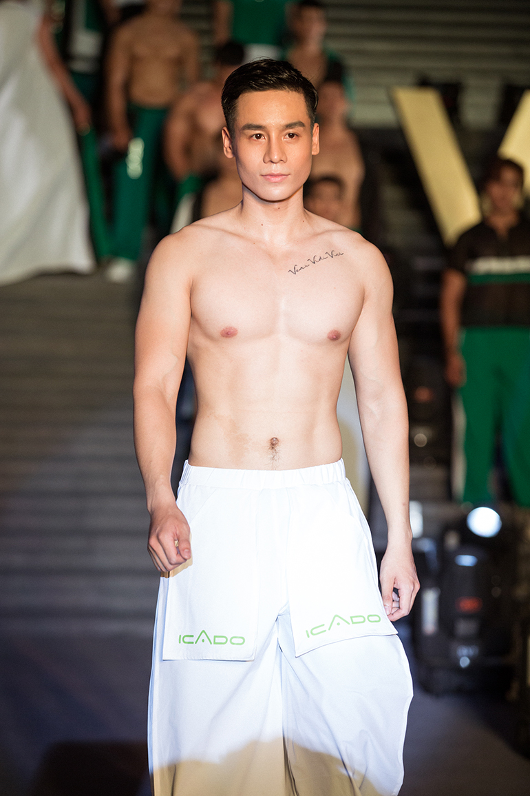 Nam Vương Cao Xuân Tài trình diễn với vị trí quan trọng ở nhiều BST. Anh khoe hình thể rắn chắc, cơ bắp cuồn cuộn với những thiết kế xuyên thấu. Người mẫu Đạt Kyo cũng cuốn hút mọi ánh nhìn với vẻ đẹp trai long lanh cùng body đẹp.