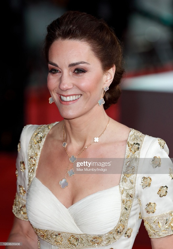 Bộ váy được thiết kế tinh tế đến từ nhà mốt Alexander McQueen đã làm bật lên nhan sắc của Công nương Anh, chi tiết xẻ ngực của váy cũng rất chừng mực, không bị phô phang. Nàng dâu thậm chí còn chọn trang sức đi kèm với hoạt tiết bông hoa rất đáng yêu