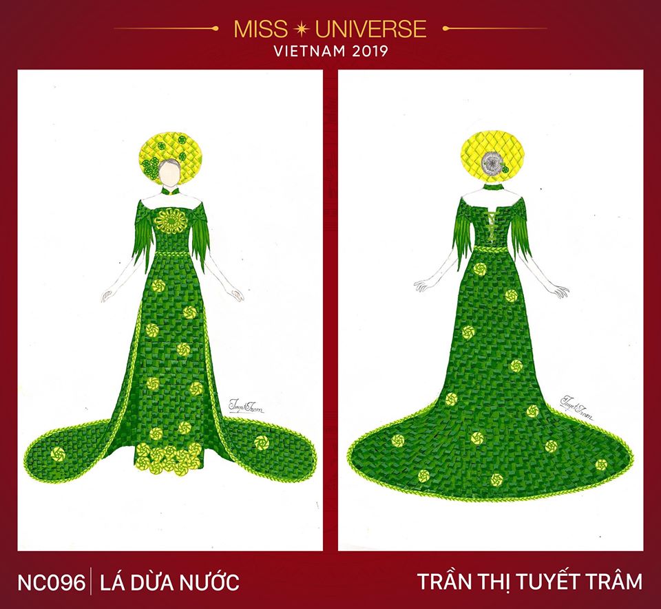 “Lá Dừa Nước ” tạo nên từ việc đan những chiếc lá dừa lại với nhau, các họa tiết, hoa văn được gấp xếp và kết lại với nhau từ lá dừa nước non (cờ bắp lá dừa nước). Cùng với đó, tà áo dài truyền thống cũng được cách điệu ở phần tay, cổ và phần thân sau.