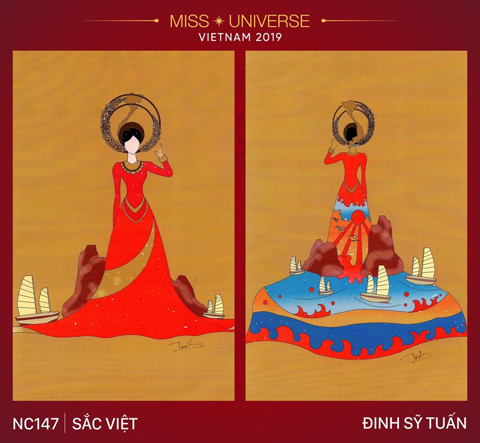 “Sắc Việt”, ý tưởng được lấy từ cây lúa và phong cảnh Hạ Long, mặt trước của thiết kế được thể hiện đơn giản nhưng vẫn tôn lên sự dịu dàng, nét đẹp của người phụ nữ Á Đông. Mặt sau được thiết kế là bức tranh sơn thủy, phong cảnh của Hạ Long. Bên trên là chiếc nón với bản đồ Việt Nam kết hợp với cây lúa - loài cây gắn liền với dân tộc Việt Nam. Các khối đá và thuyền được thiết kế nổi dạng 3D tạo thành một vùng biển phía sau tà áo.