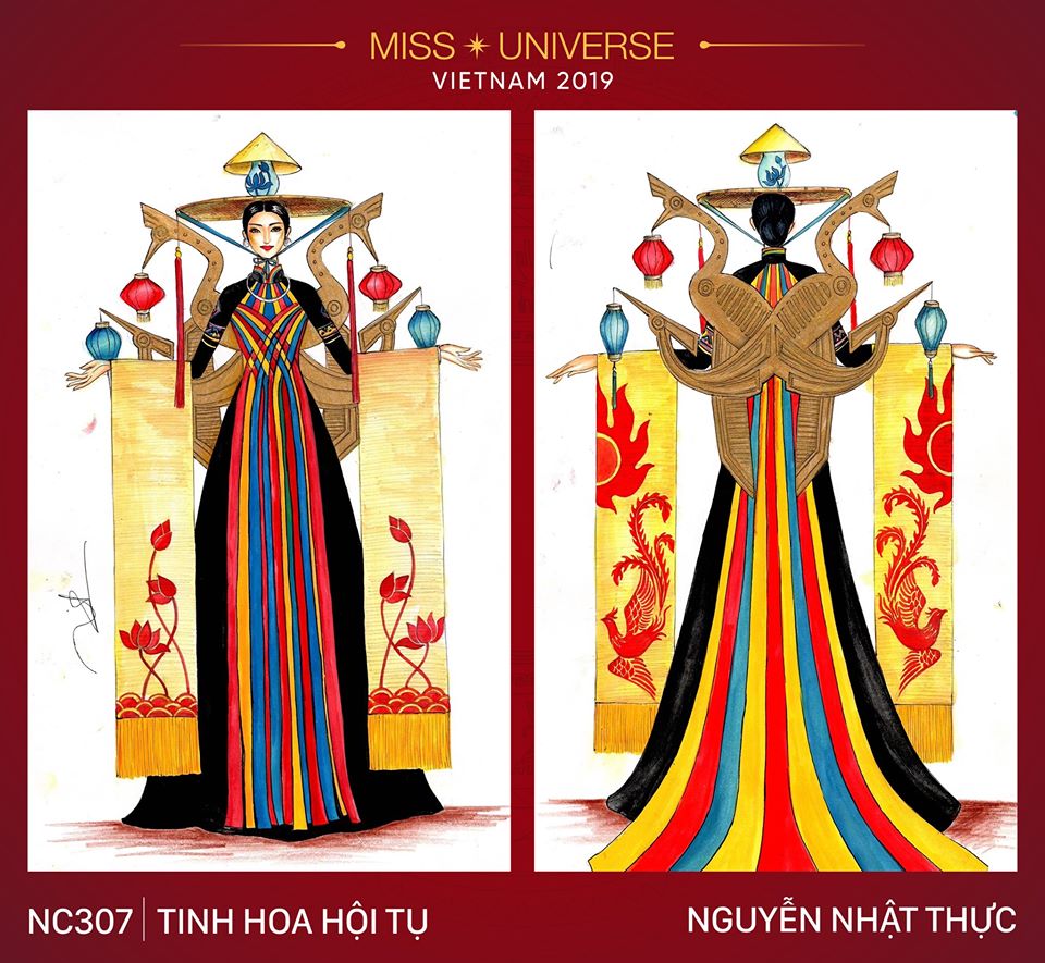 “Tinh Hoa Việt Nam”, lấy ý tưởng từ những bức pháp lam đặc trưng trong kiến trúc cổng tam quan của cung đình Huế, kết hợp nét độc đáo của những cánh diều để làm tiền đề cho ý tưởng bộ trang phục này.