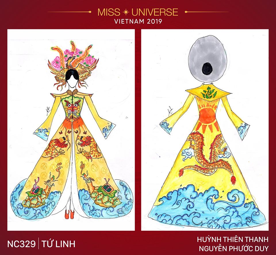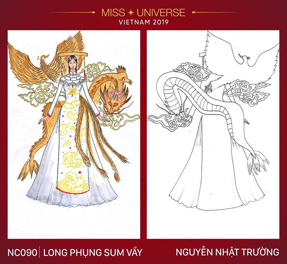 Ở mủa giải thứ nhất, chỉ có 1 trong 3 tà áo dài được xuất hiện trên sân khấu Miss Universe. Trong khi đó hai bộ còn lại đành đắp chiếu. Trong ảnh là bộ trang phục lấy cảm hứng từ áo dài cung đình với những thiết kế họa tiết chim phượng quyền quý, sang trọng cùng gam màu hoàng tộc.