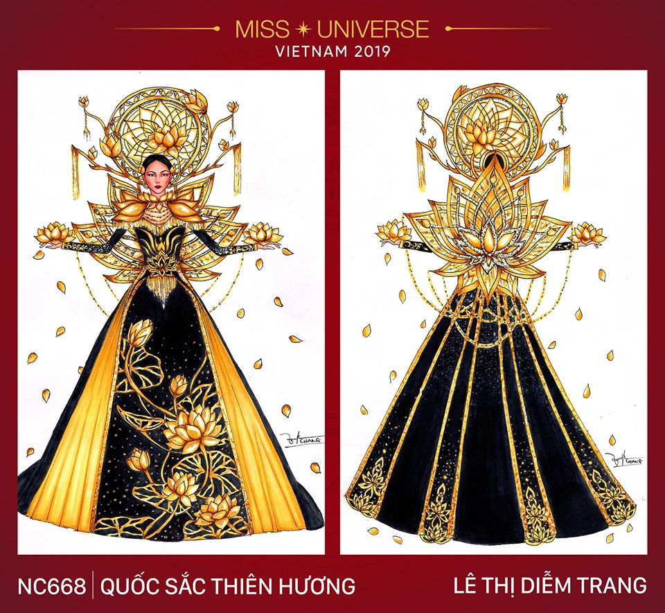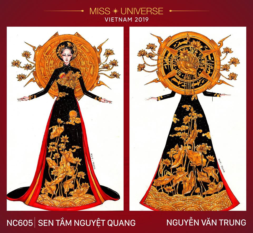 Với hình ảnh Sen được soi sáng dưới ánh trăng vàng, tạo nên một tổng thể màu sắc lung linh, tựa như từng cánh hoa sen đang tắm dưới ánh trăng vàng. Một chút biến tấu hình ảnh trăng thành trống đồng - mang đậm tính dân tộc và thành quả là một bộ National Costume mang tên “Sen tắm nguyệt quang”.