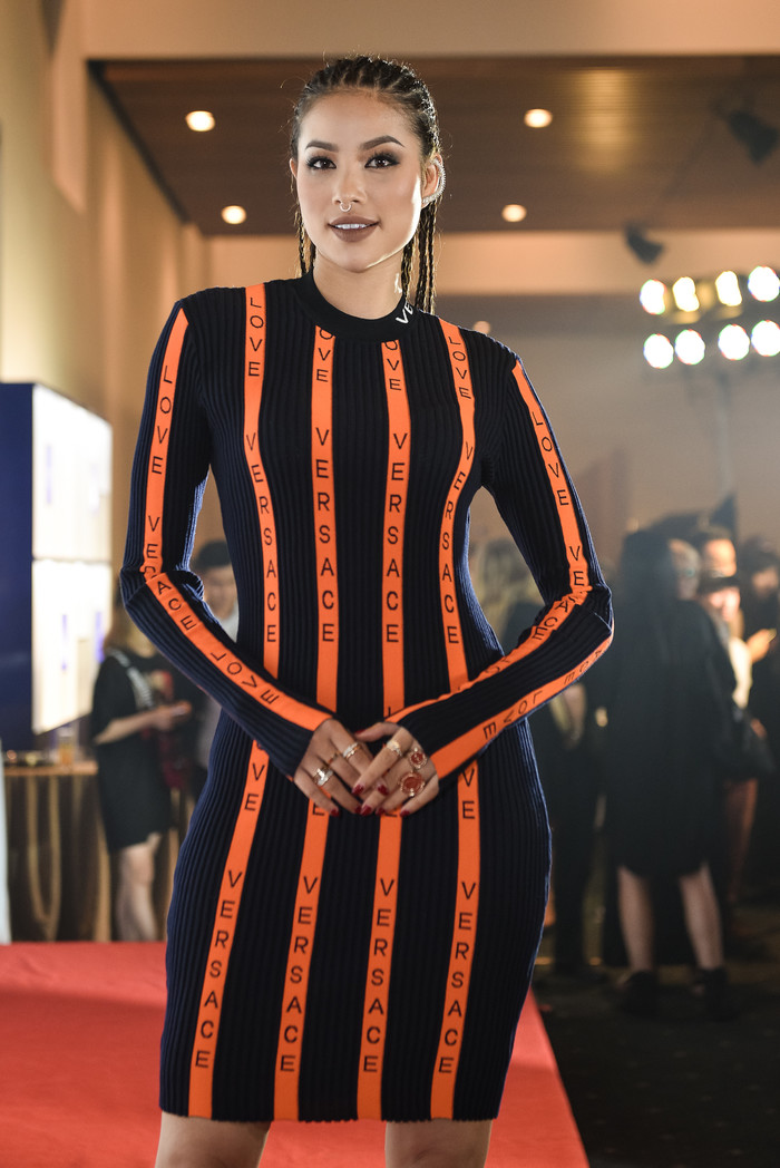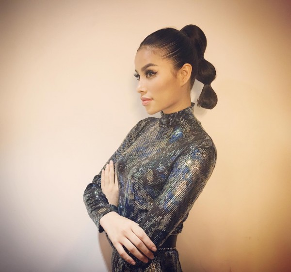 Gương mặt trái xoan cùng nét cá tính của Phạm Hương được phát huy khi cô chọn kiểu tóc tết búi ở đỉnh đầu, phần mái ôm sát đầu để gương mặt được trang điểm chỉn chu tỏa sáng.