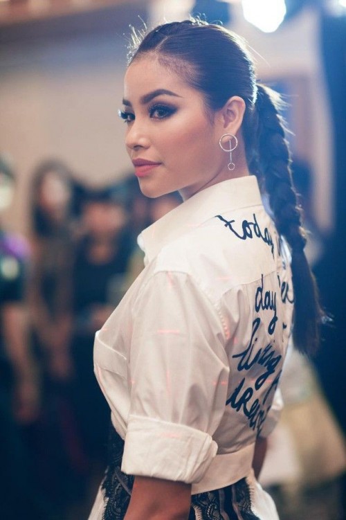 Cũng với mốt tóc tết đuôi sam, nhưng lần này Phạm Hương vô cùng cá tính với với phần đuôi tóc cột cao, đỉnh đầu và mái được tém gọn để trông cá tính hơn. Đi kèm là bộ trang phục phá cách in họa tiết chữ viết độc đáo.