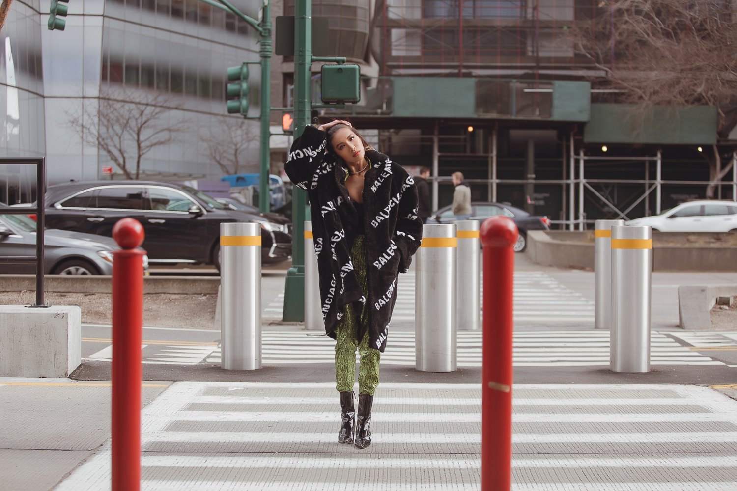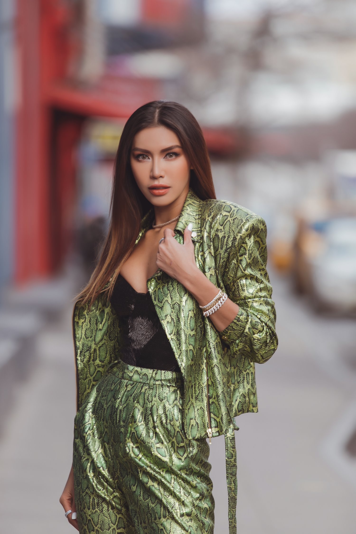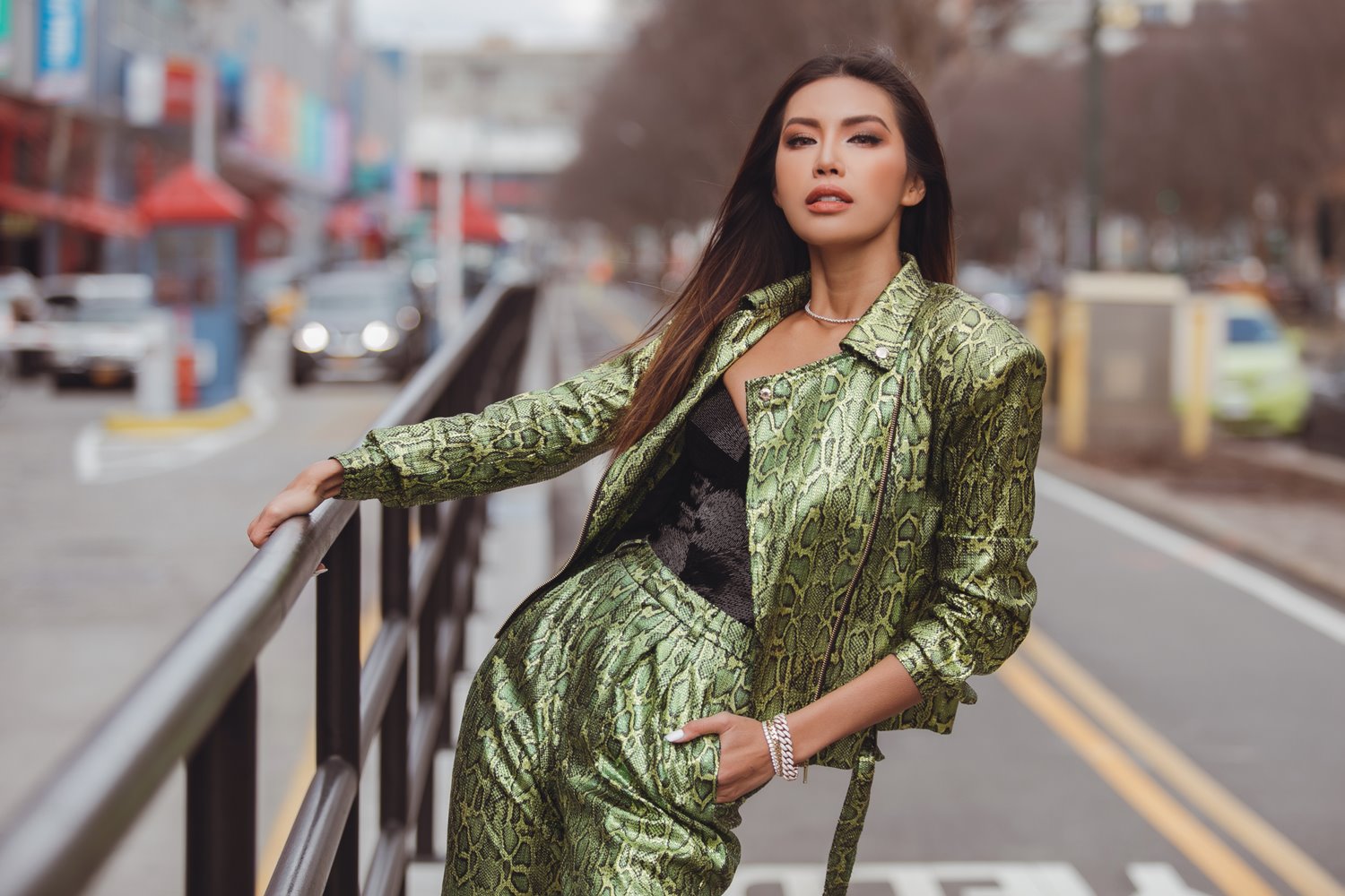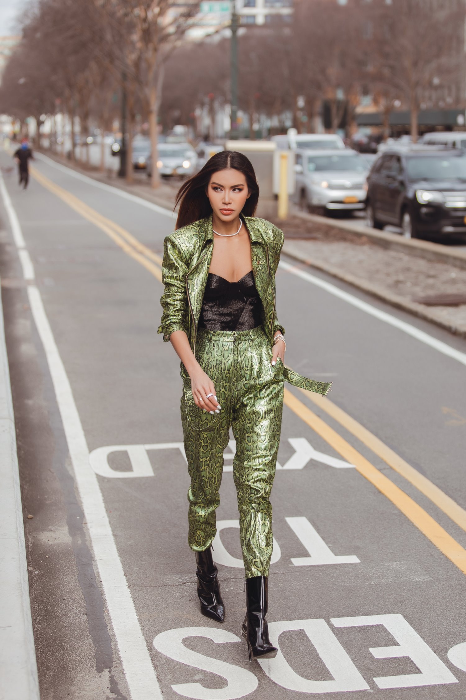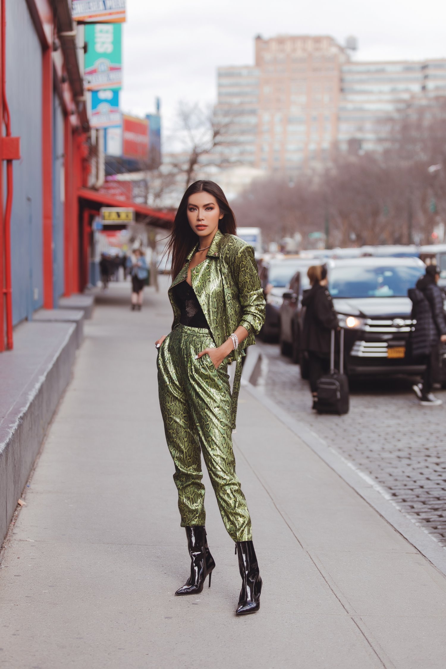 Cô ghi điểm với phong cách menswear, mạnh mẽ, cá tính cùng màu neon chủ đạo kết hợp với hoạ tiết da rắn đầy nổi bật ngay tại một trong sáu kinh đô thời trang lớn nhất thế giới.