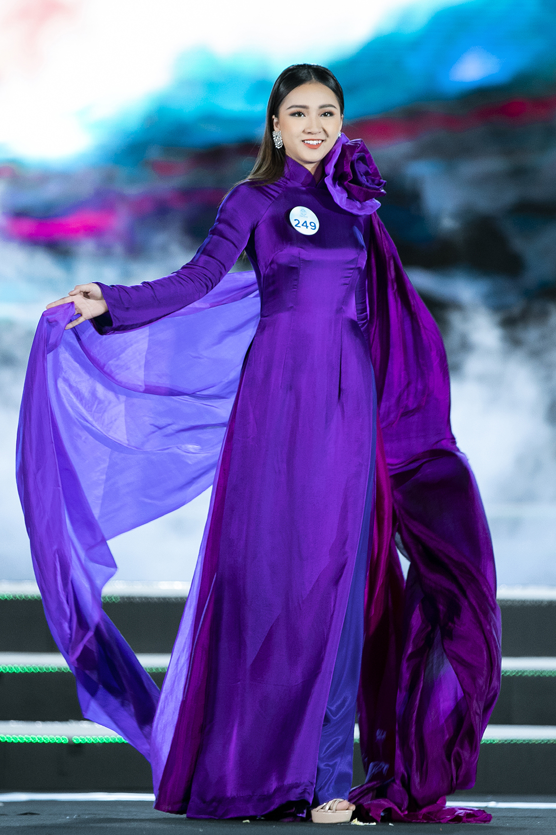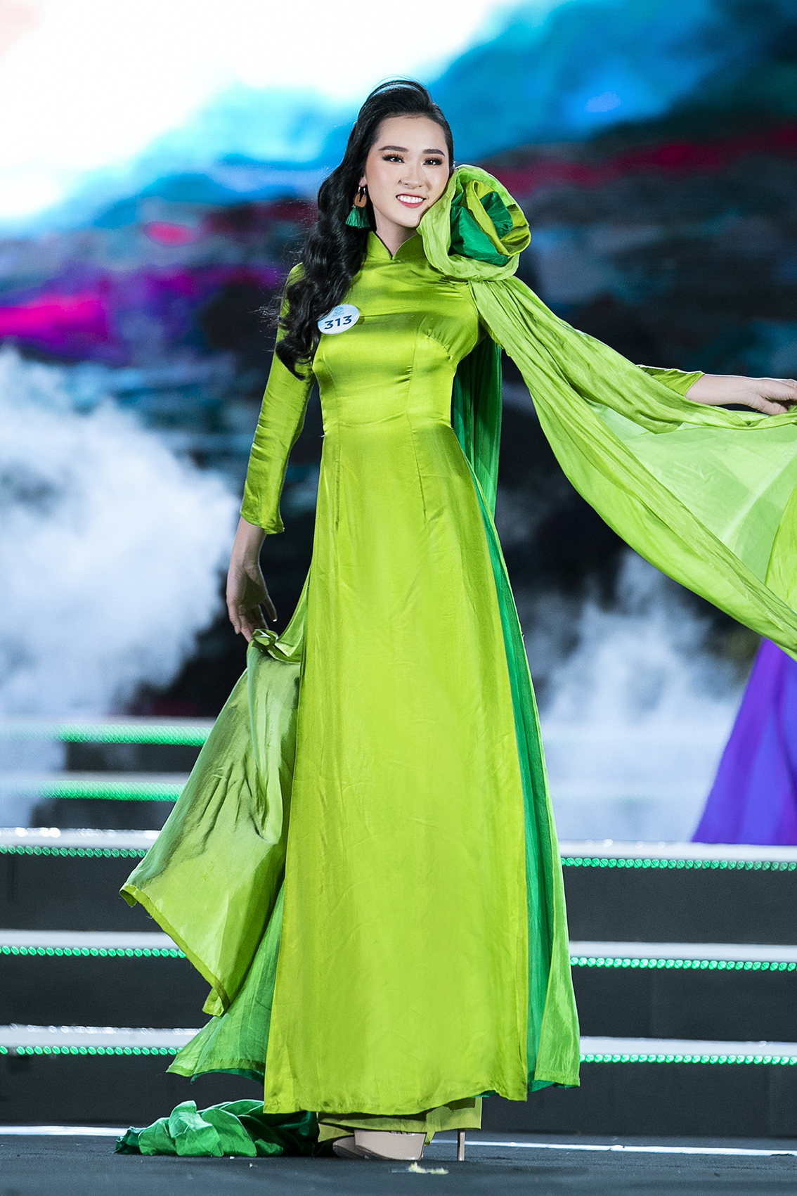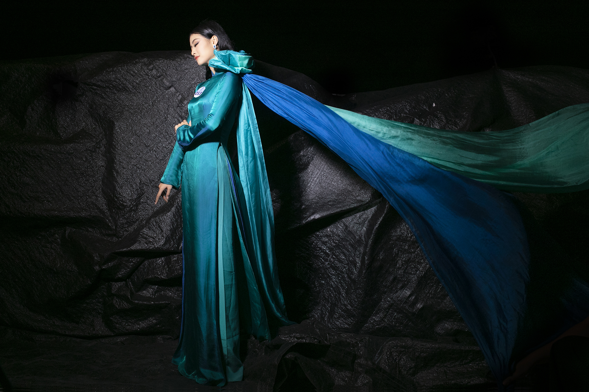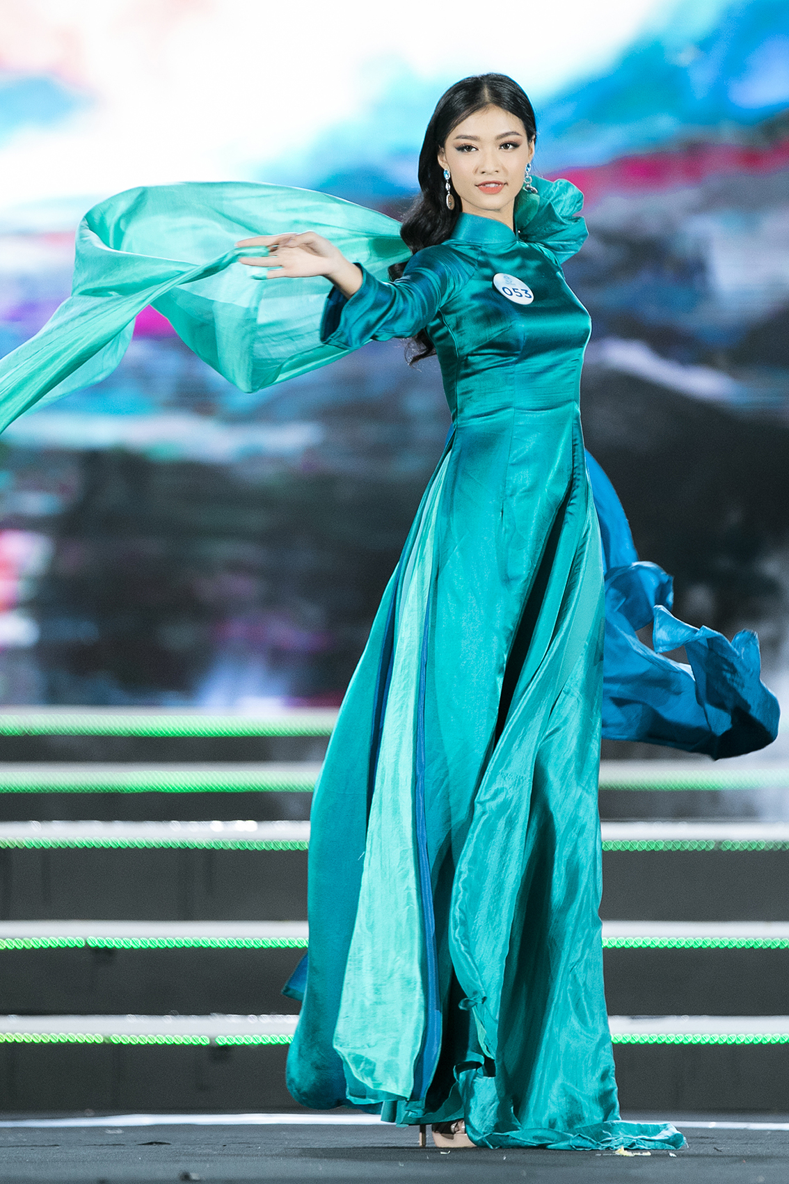 Diện thiết kế màu xanh thanh tú có phần tà bay bổng, á hậu Kiều Loan thu hút sự chú ý bởi vẽ nền nã, tao nhã của mình.