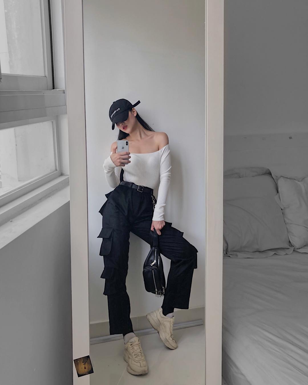 Phương Khánh cực quyến rũ với áo trễ vai, chiếc quần kaki túi hộp cực kén dáng được cô nàng chinh phục ngon lành với đôi chân thon dài. Để tăng tính sporty cho trang phục, nàng hậu mix thêm đôi daddy sneaker to sụ và nón lưỡi trai cool ngầu.
