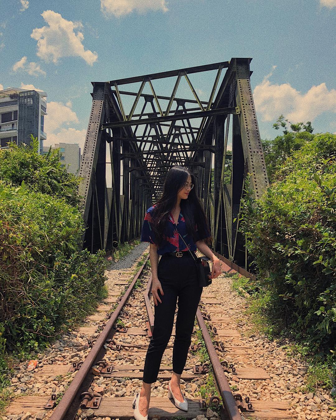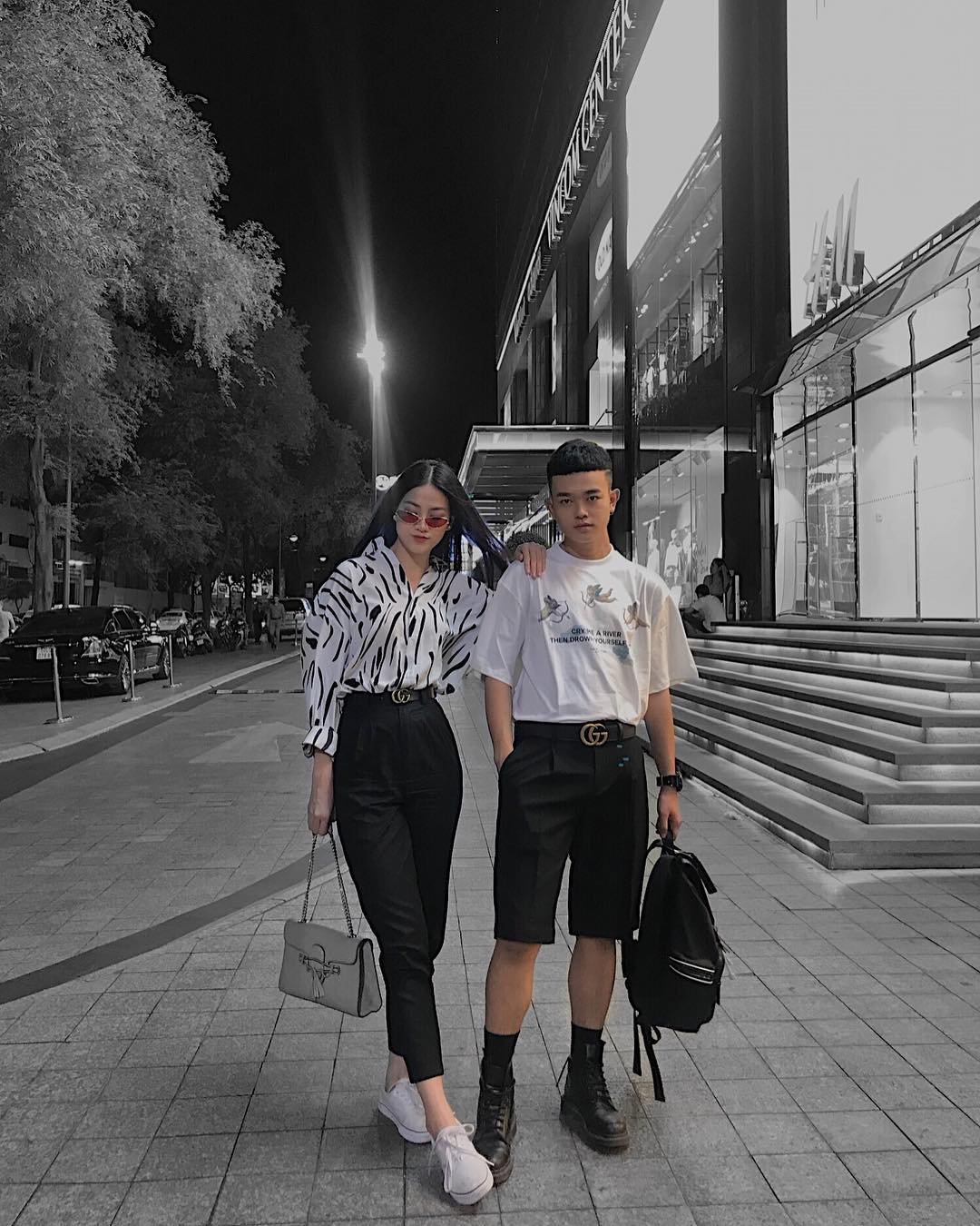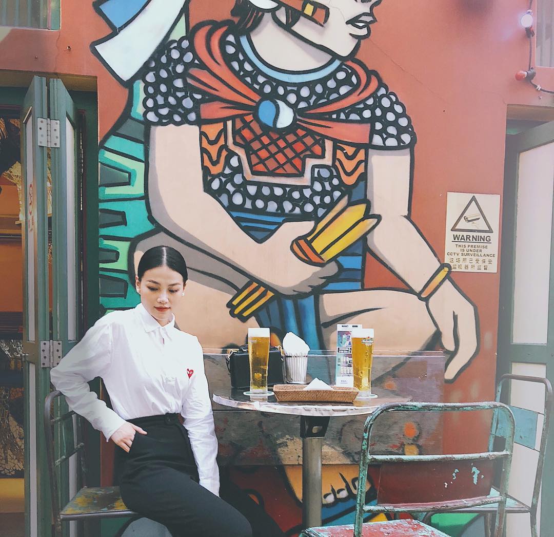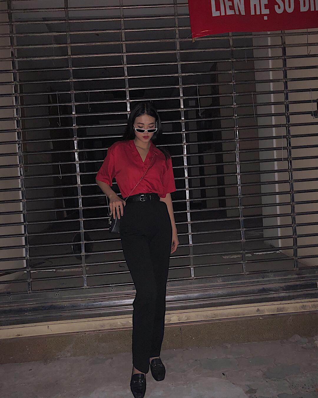 Chiếc áo sơ mi họa tiết và quần âu đen cổ điển được Phương Khánh thổi làn gió mới tươi trẻ khi phối cùng giày bata trắng thể thao. Cô không quên đeo thêm cặp kính màu thời thượng để nhấn nhá cho set đồ.