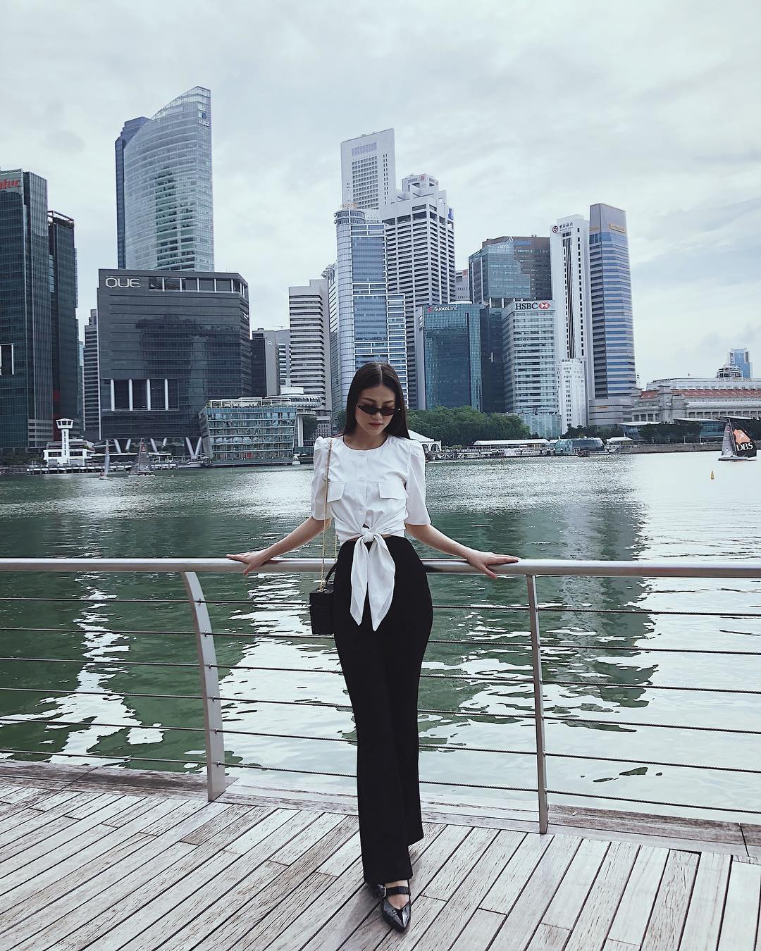 Quần ống loe được Phương Khánh mix khéo léo với áo kiểu cột nơ eo tạo nên tổng thể vừa thời thượng vừa thanh lịch.