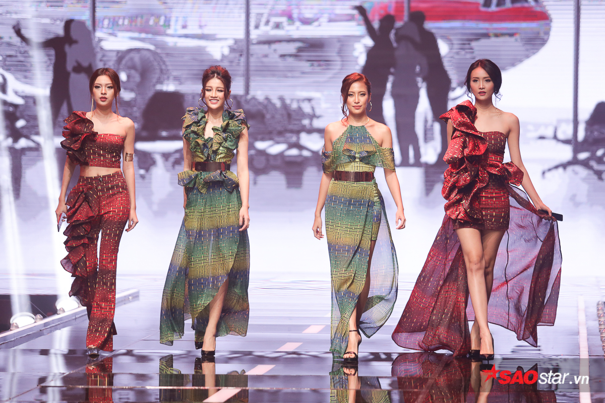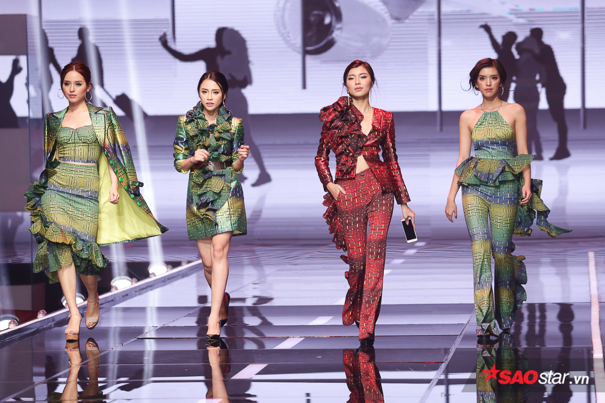 4 cô gái xuất sắc nhất đến từ team Moew khoe dáng trong những bộ cánh có thiết kế độc đáo. Hoạ tiết xuyên suốt bộ sưu tập lấy âm hưởng từ bộ sưu tập Orphics nhưng được biến đổi sang tông màu đỏ nhung và màu xanh lá với hiệu ứng ombre chuyển màu trên vải.