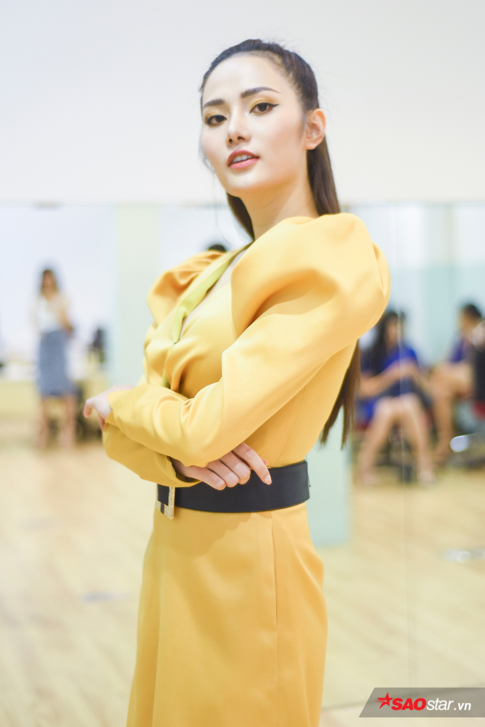 Trong buổi huấn luyện này, người đẹp tập trung rèn luyện về kỹ năng trình diễn áo dài, cách đi đứng, đặt tay sao cho thật dịu dàng, nền nã.