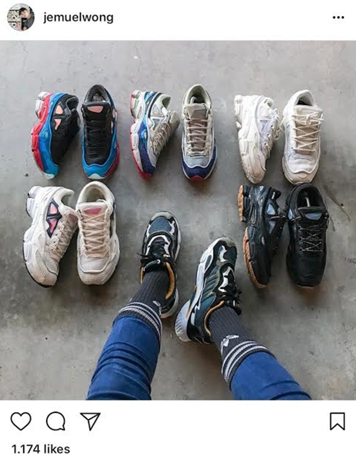 Sở hữu tới 6 đôi Raf, bức ảnh khoe khéo được sắp xếp ngay hàng thẳng lối với màu sắc tùy ý, những đôi giày kinh điển của Raf Simons cứ thế chễm chệ lọt top nhứng tấm ảnh sneaker không ngó lơ được.